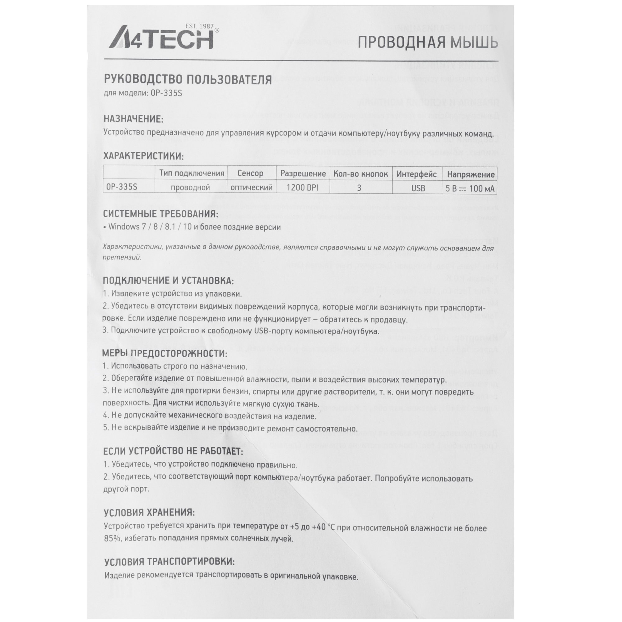 Мышь проводная A4Tech OP-335S черный, 1200 dpi, USB, кнопки - 3