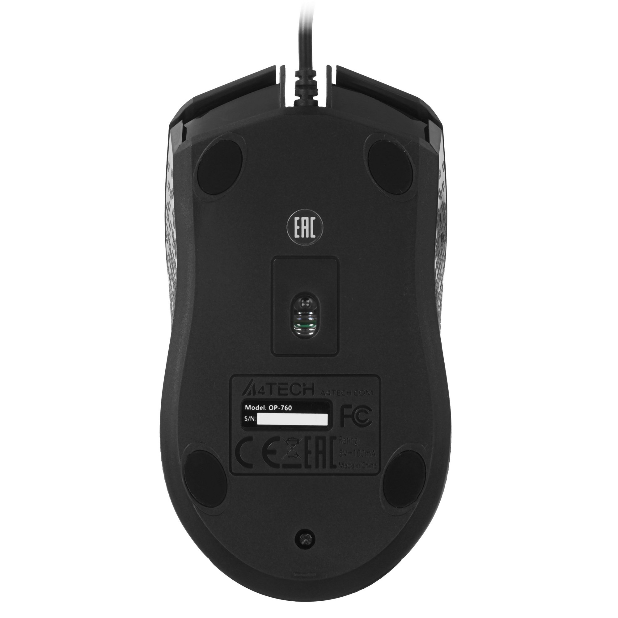 Для подключения к компьютеру или ноутбуку компьютерная мышка A4 OP-760 весом 110 гр. использует кабель с коннектором USB Type-A на конце. Устройство получает питание по кабелю длиной 1.5 м.
