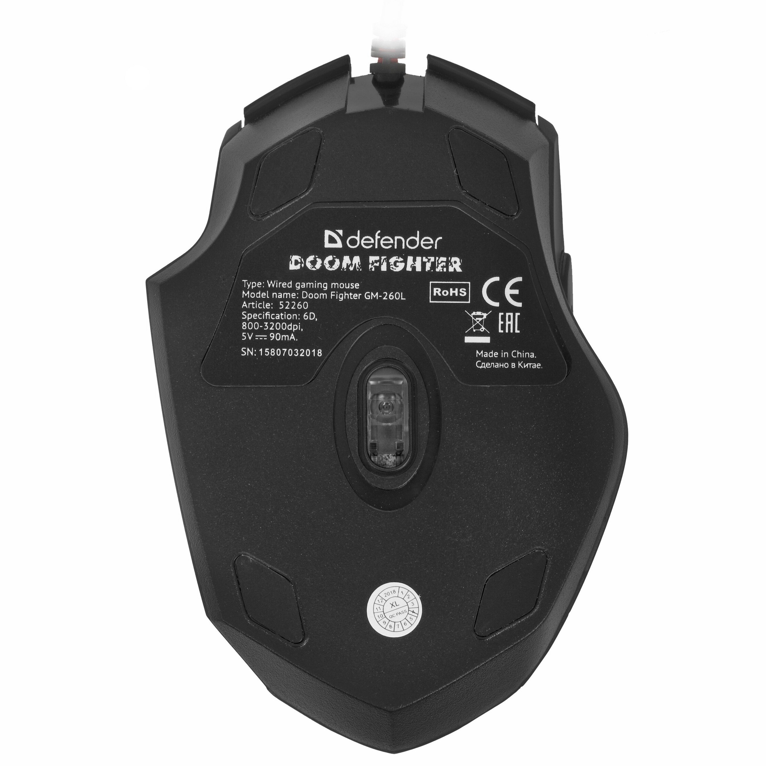 Особенность мыши Defender Doom Fighter GM-260L в поддержке подсветки, которая играет разными цветами, что позволяет создать игровую атмосферу. Корпус устройства предусматривает 6 кнопок, которые обеспечивают комфортное пользование мышью. Среди них – 5 программируемых клавиш: их можно настроить на выполнение определенных задач, которые сохраняются в памяти, что позволяет возвращаться к ним при последующих загрузках игр. Корпус мыши предусматривает прорезиненное покрытие, препятствующее скольжению ладони.