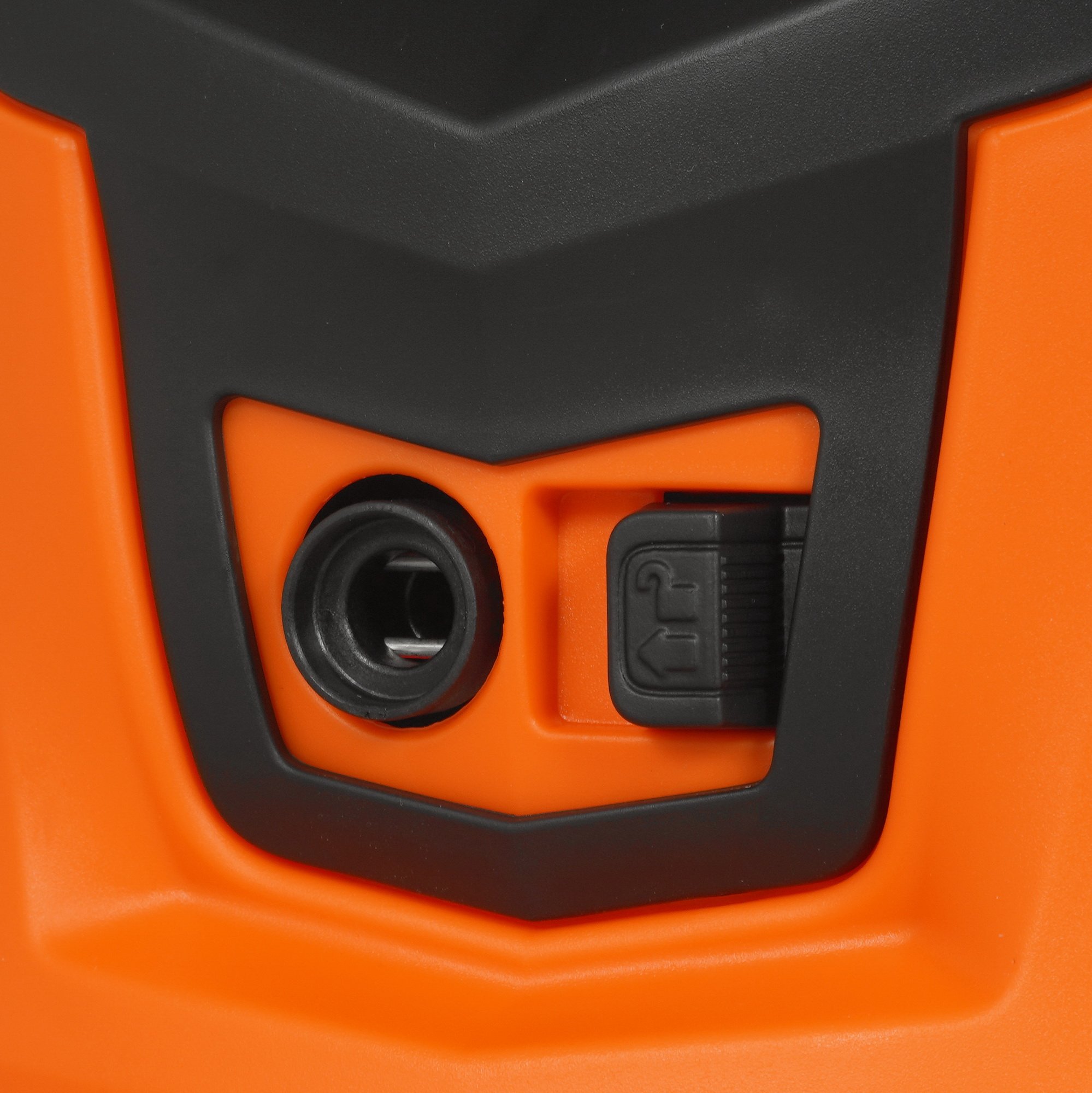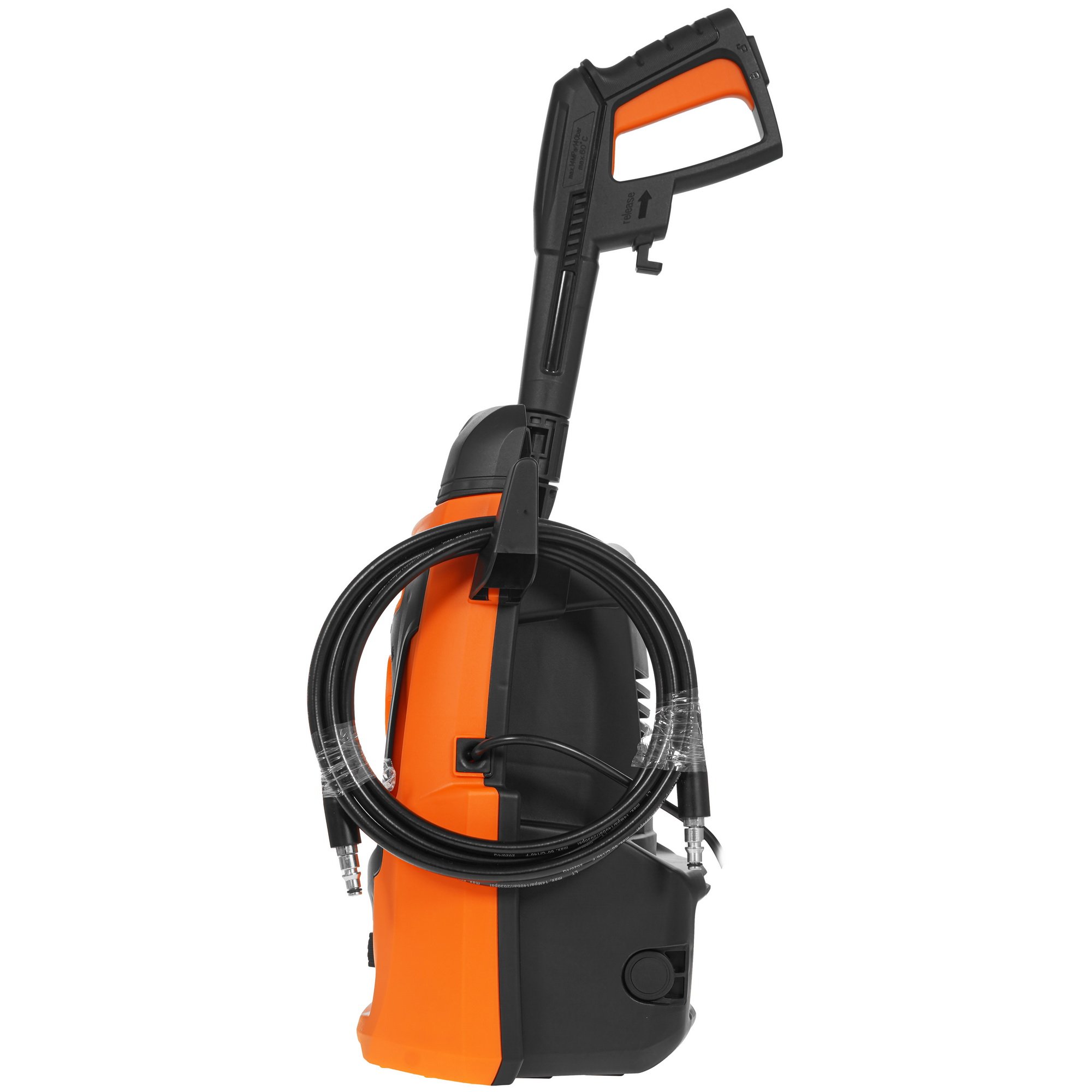 Для подключения мойки к электрической сети используется 2-метровый шнур. Есть возможность намотки сетевого шнура. Длина шланга высокого давления составляет 5 м. В комплектацию минимойки, в частности, входят насадка переменного давления и чистящая игла. Корпус мойки имеет оранжевый цвет.