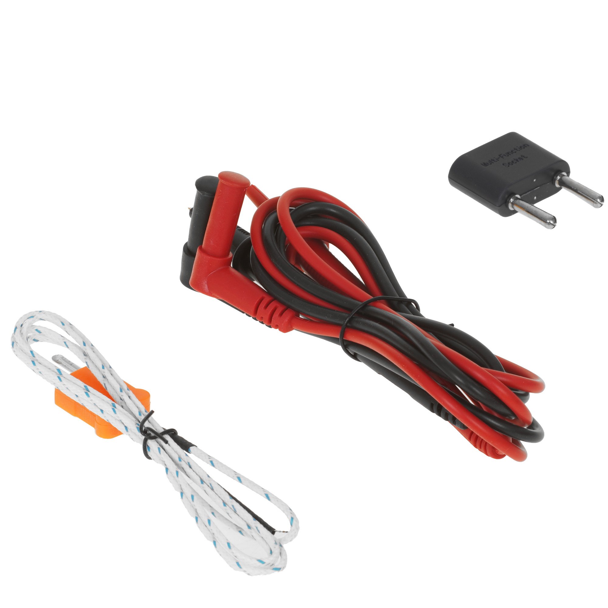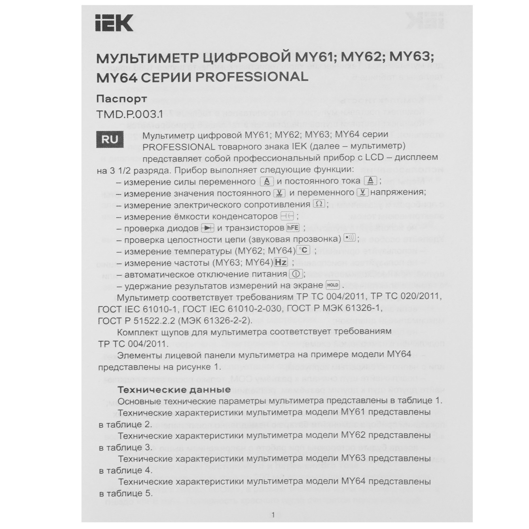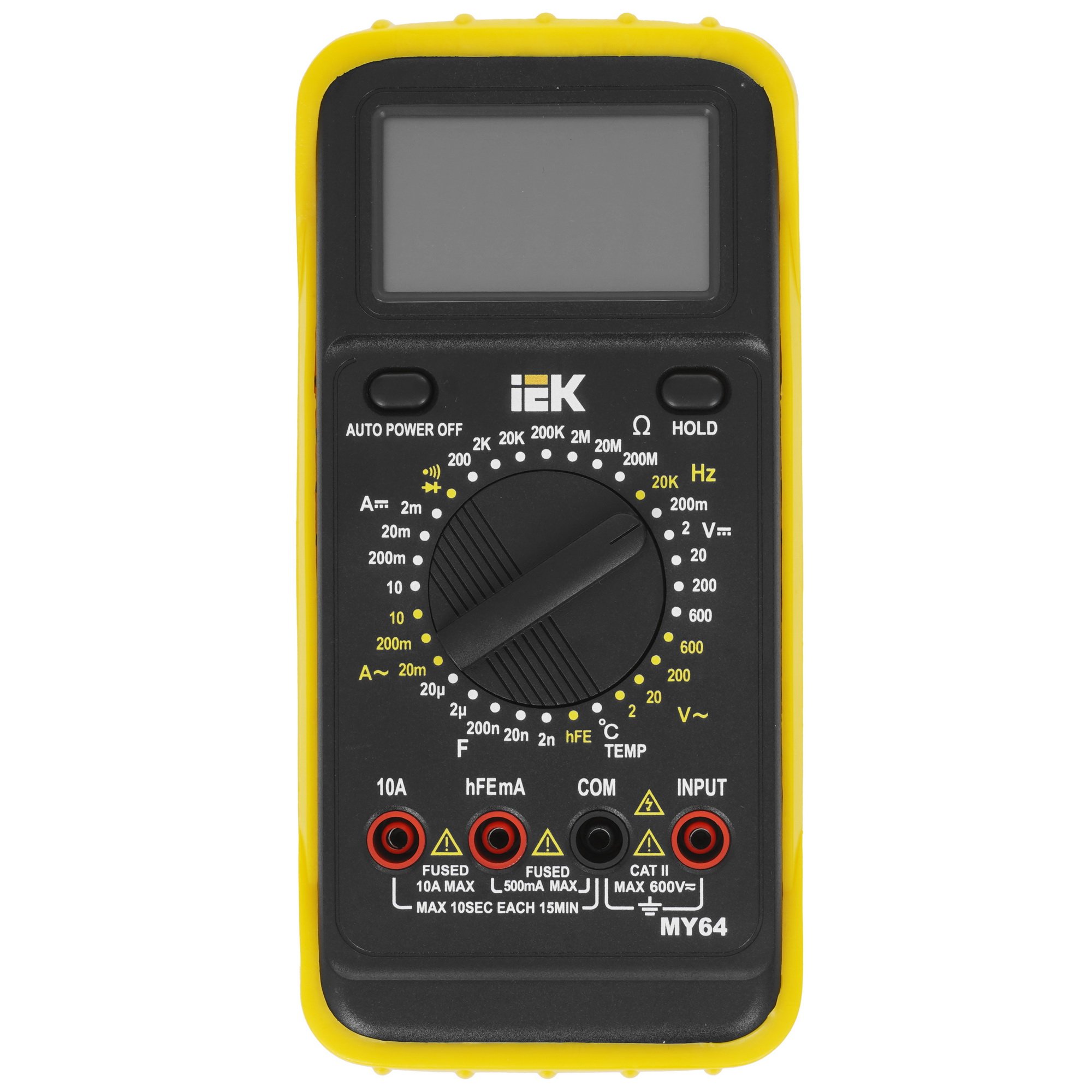 Мультиметр IEK Professional MY64 охватывает широкий спектр измеряемых величин. Например, максимальный диапазон для напряжения переменного тока (AC) составляет 700 В с чувствительностью от 100 мВ. Благодаря этому можно работать с сетями до 300 В II категории. Для постоянного напряжения (DC) предел составляет 600 В с минимальной чувствительностью 0,1 мВ. Этого достаточно для тестирования батареек или электронных компонентов устройств. Мультиметр измеряет сопротивление в диапазоне от 200 Ом до 200 МОм с чувствительностью от 0,1 Ом. Благодаря этому можно проверять проводку, резисторы и надежность изоляции. Прибор также способен измерять температуру от 0°C до 750°C. Среди дополнительных функций: измерение проводимости материалов и растворов, расчет мощности и проверка диодов 2,8 В / 1 мА.