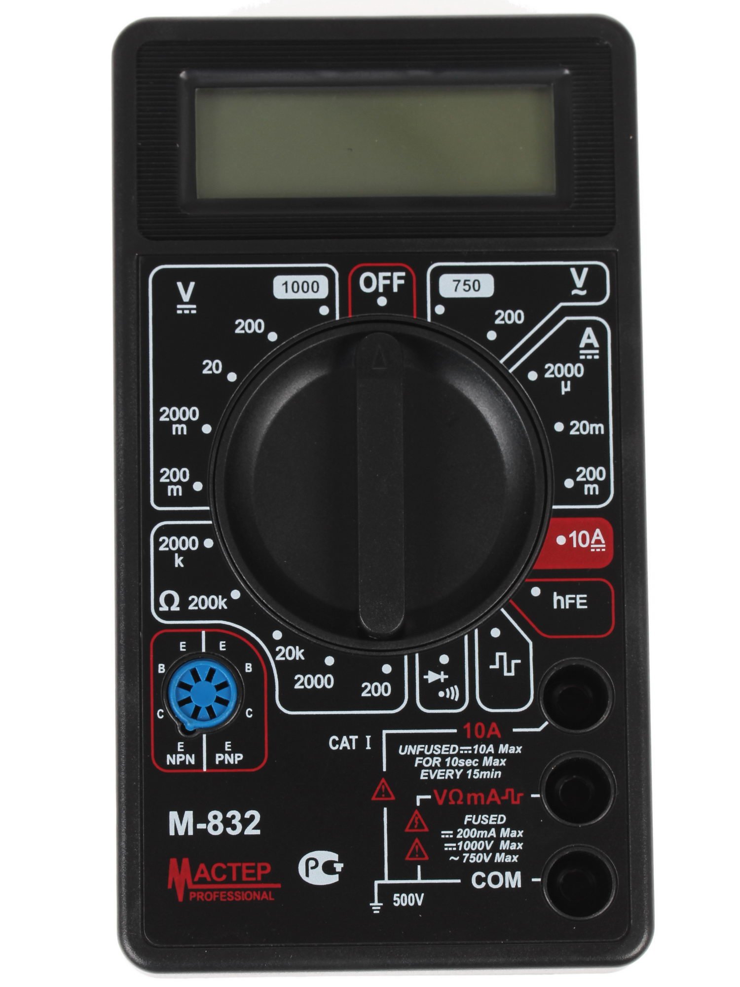 Мультиметр Master Professional M832 позволяет произвести тестирование электрической сети и всех ее элементов для выявления дефектов, он применяется для замера постоянного и переменного напряжения в сети, измерения сопротивления ее составляющих. Для питания прибору необходима всего одна батарейка напряжением 9 В, а параметры измерения пользователь выставляет вручную при помощи переключателя. Данные замеров выводятся прибором на небольшой дисплей, расположенный на передней панели над переключателем.