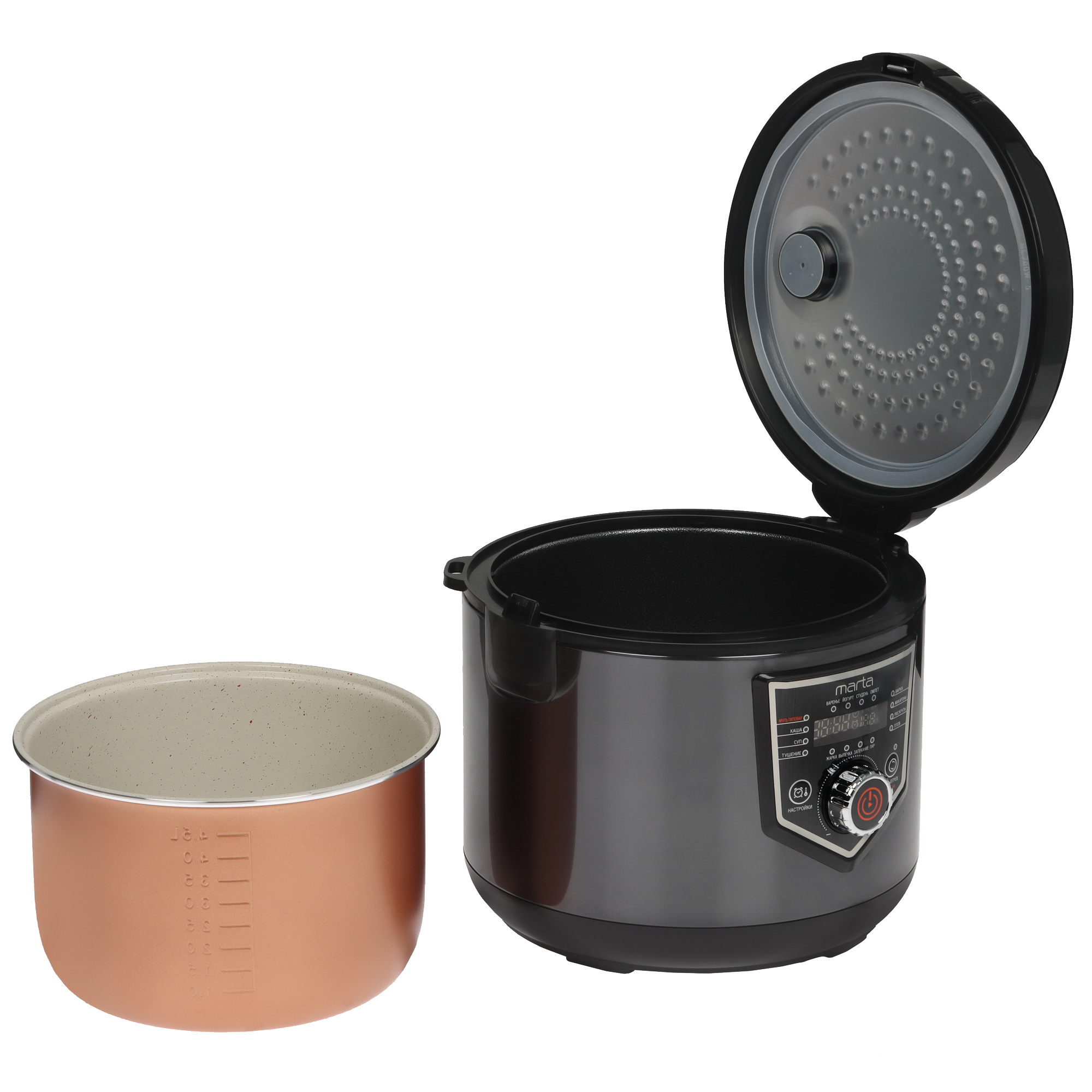 Мультиварка Marta MT-MC4336A управляется при помощи кнопок и удобного поворотного механизма, которыми можно выбирать режимы и дополнительные настройки. Модель MT-MC4336A предлагает 16 предустановленных программ, позволяющих готовить широкий спектр блюд, от супов и каш до выпечки и йогуртов. Функции поддержания температуры и запланированного старта позволяют сохранять блюда теплыми и готовить их к определенному времени. Чаша с керамическим покрытием обеспечивает антипригарные свойства и легкость в уходе.