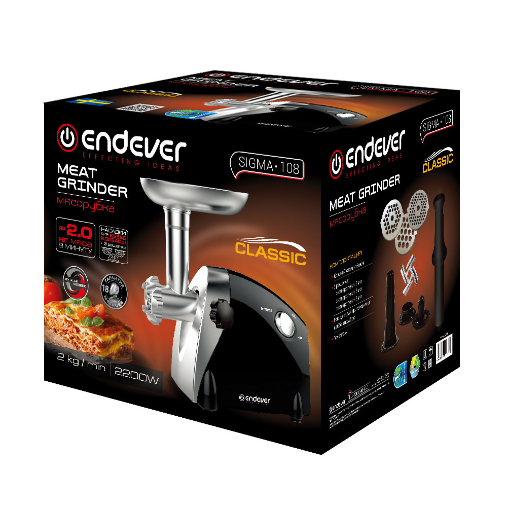 Мясорубка Endever Sigma-108 станет незаменимым помощником в приготовлении еды. С мощностью в 2200 Вт и производительностью до 2 кг мяса, мясорубка Sigma-108 быстро и эффективно измельчит сырое мясо для Ваших блюд. Мясорубка оснащена ножом и шнеком из нержавеющей стали, что делает модель долговечной в использовании. Прочный стальной нож обеспечивает правильную рубку, измельчение любых видов мяса и других продуктов, сохраняя их структуру.