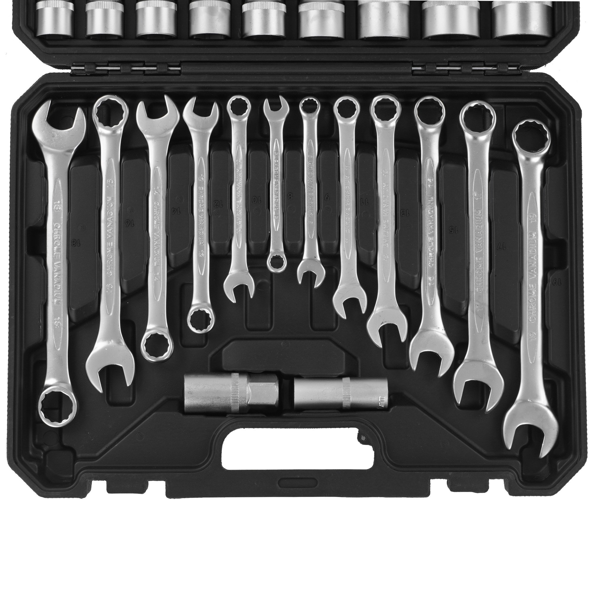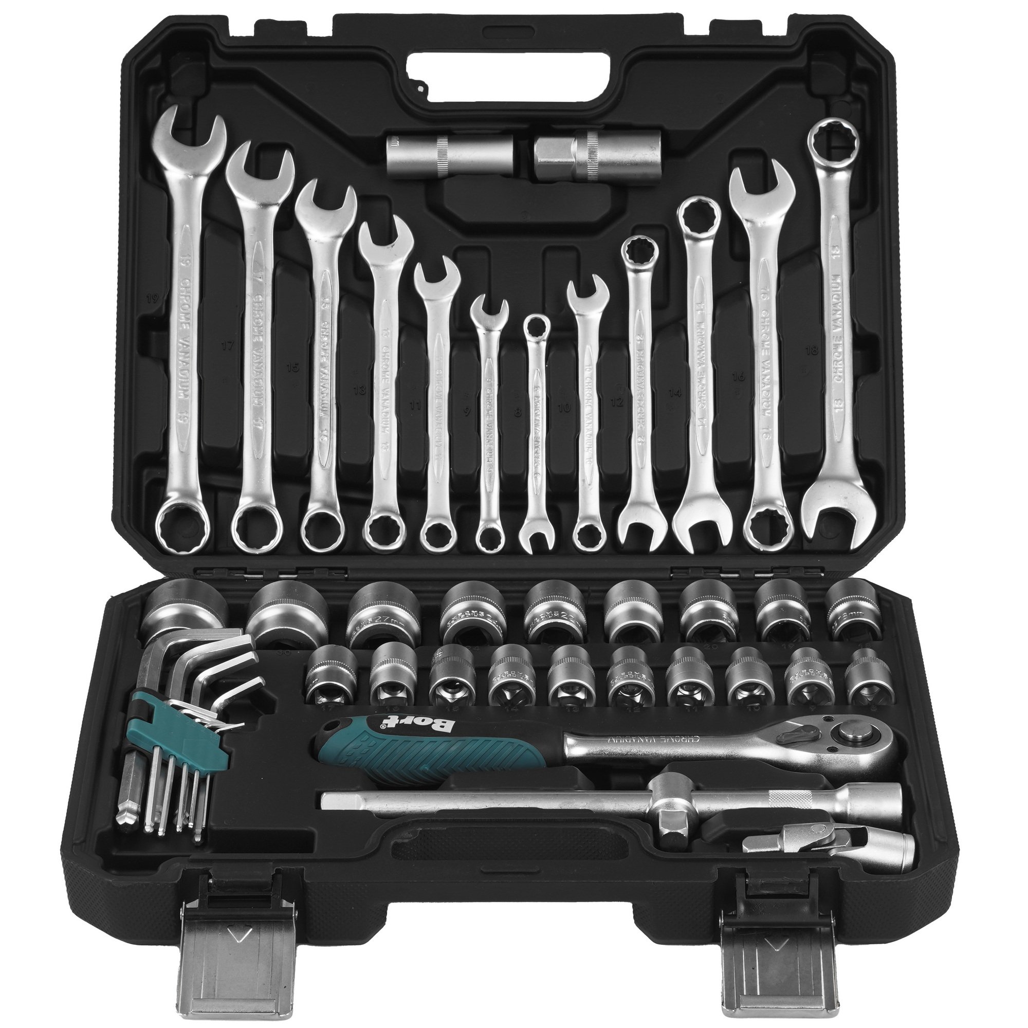 Набор инструментов BTK-47 включает в себя 47 предметов: ключи комбинированные, головки, головки торцевые, удлинители, рукоятка с трещоткой и т.д. Все предметы находятся в кейсе. Все металлические элементы сделаны из высокопрочной хромованадиевой стали, которая выдерживает высокие нагрузки, не деформируется при интенсивном использовании.