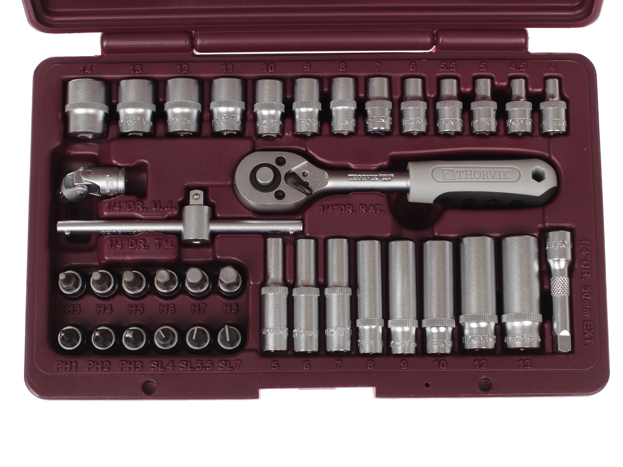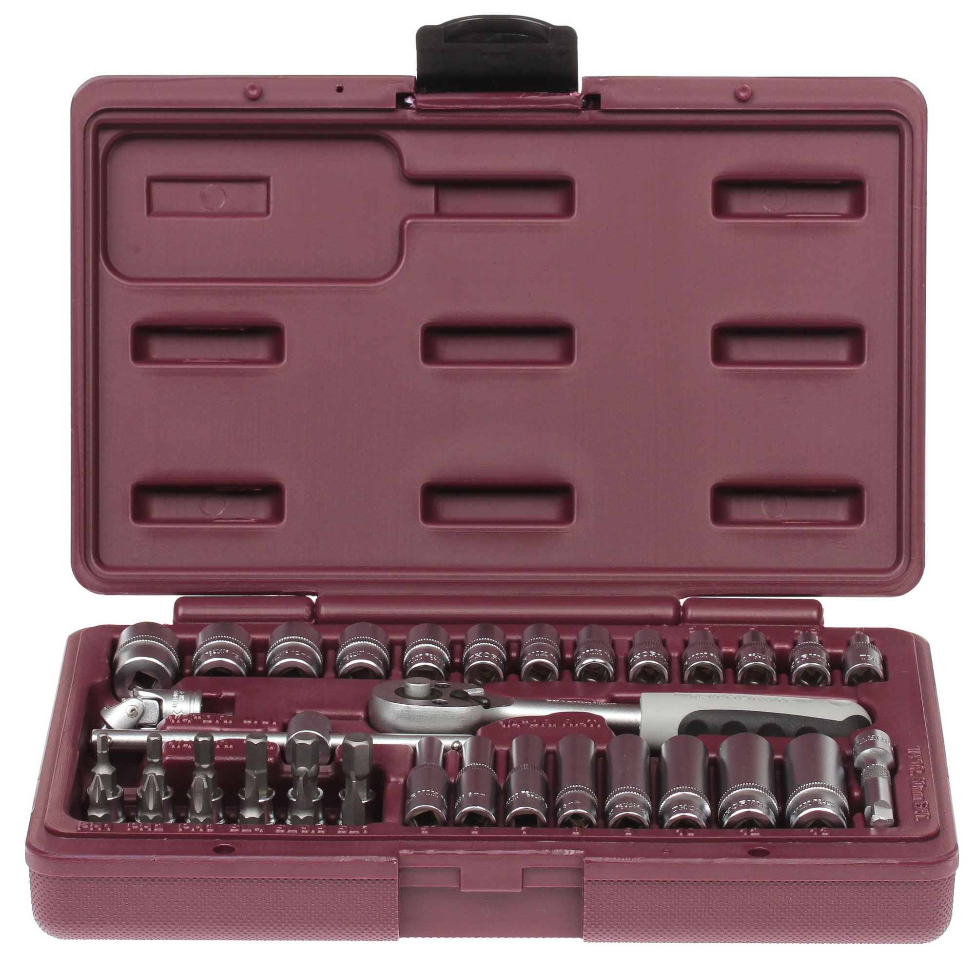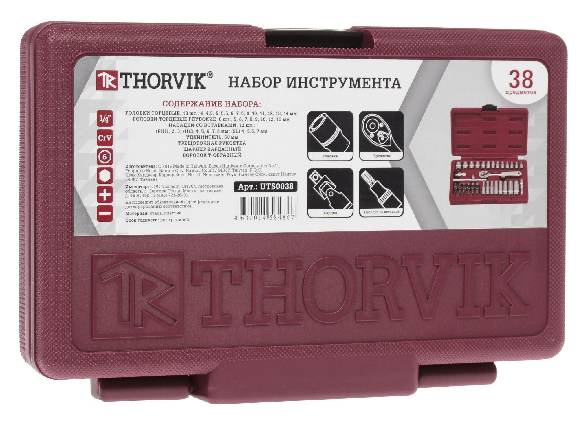 Комплект набора инструментов Thorvik UTS0038 включает компактный кейс с 38 предметами, которые изготовлены из хромванадиевой стали. Он пригодится каждому автомобилисту, и включает такие важные предметы, как карданный шарнир, трещоточная рукоятка и Т-образный вороток. Множество торцевых головок подойдут для любых случаев. Такой набор пригодится не только автолюбителю, но и каждому хозяйственному человеку.