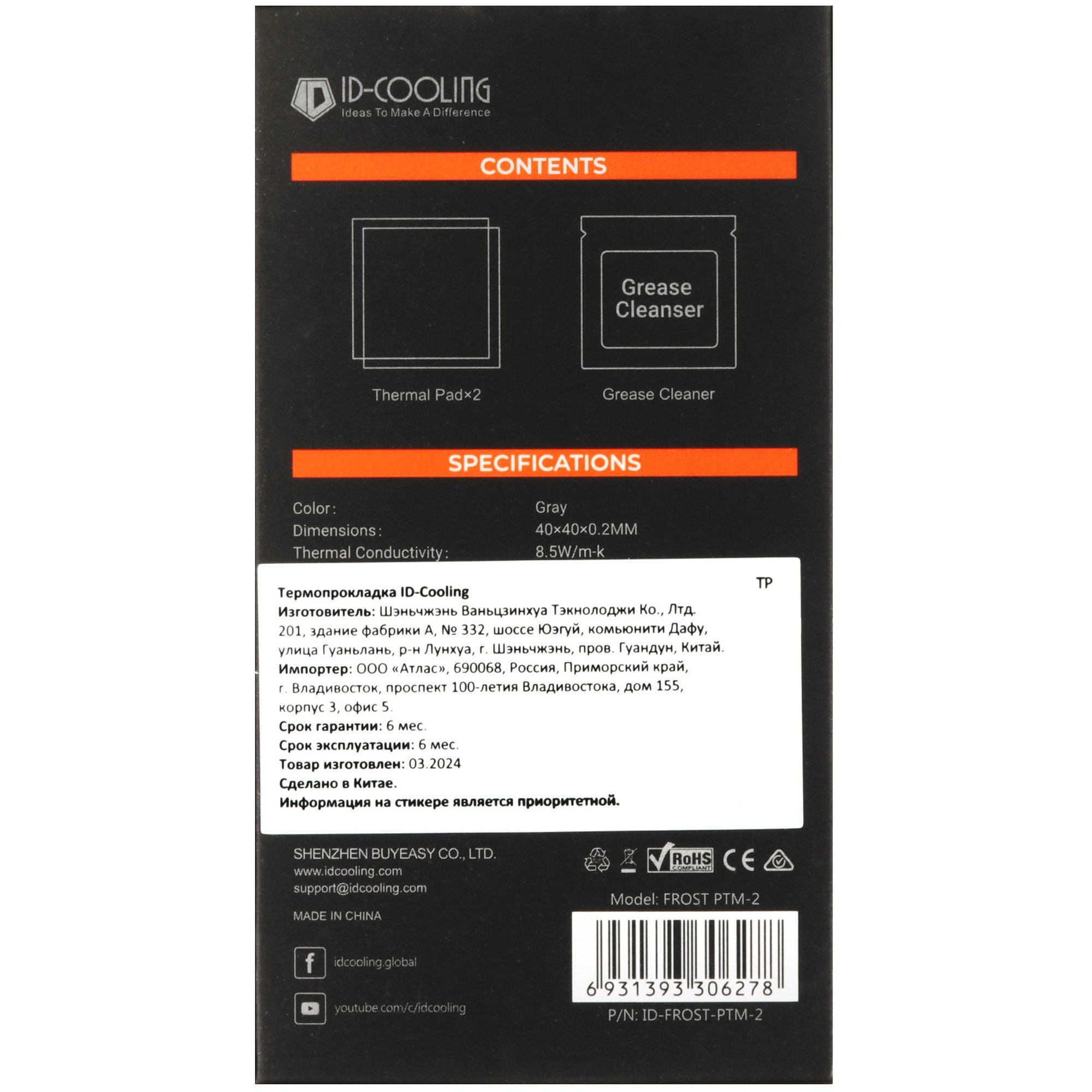 Термопрокладка ID-Cooling FROST PTM-2 поставляется в количестве 2 штук. Толщина изделия составляет 0,2 мм. Хранить можно в течение длительного времени (в условиях помещения).