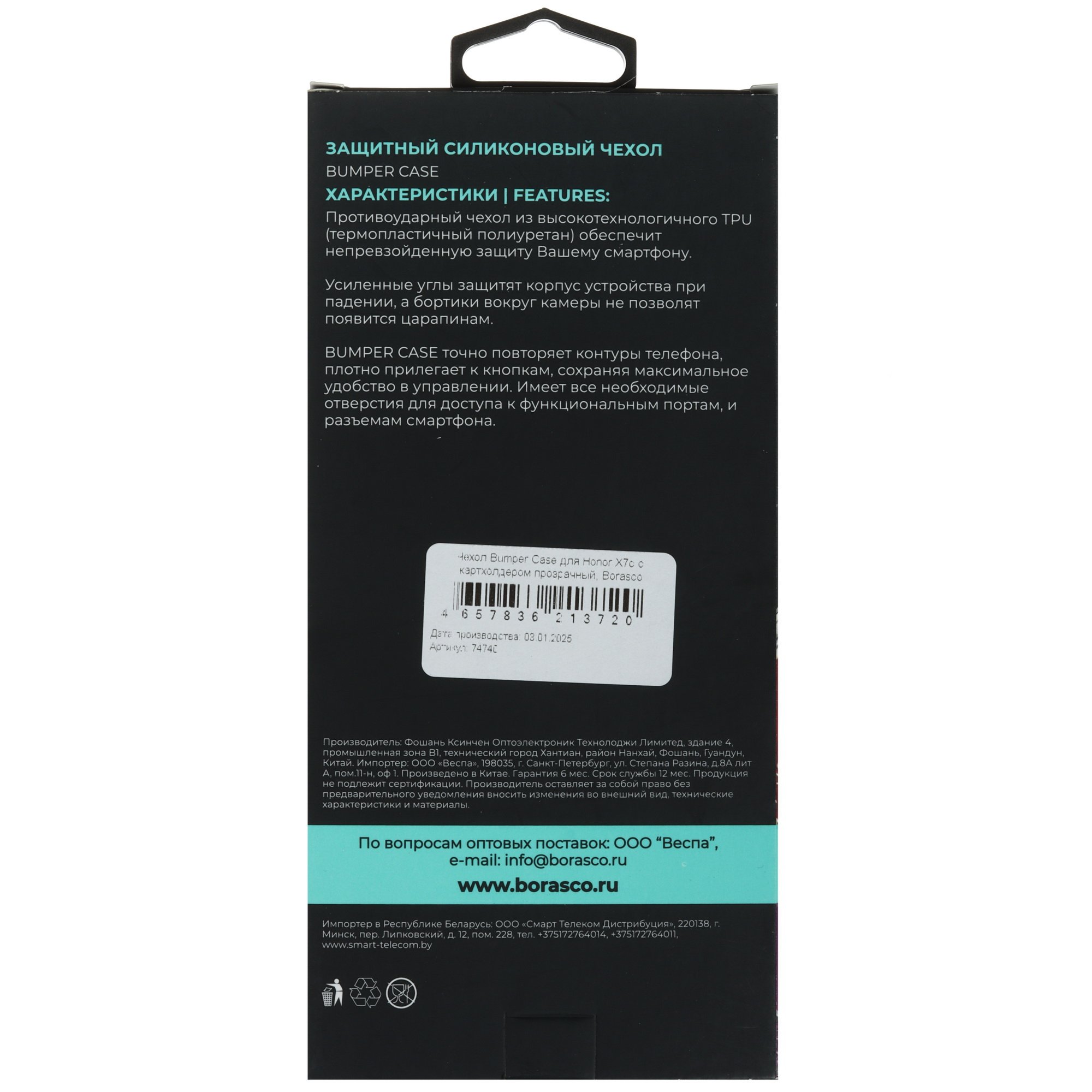 Накладка BoraSCO Bumper Case для HONOR X7c прозрачная с усиленными углами предназначена для защиты смартфона HONOR X7c. Чехол закрывает всю заднюю панель, углы и боковые грани. Он предотвращает внутренние повреждения при ударе, защищает корпус от царапин и сколов. Накладка также убережет ваш телефон от воды. Аксессуар имеет отверстия под объектив камеры, зарядку и наушники.