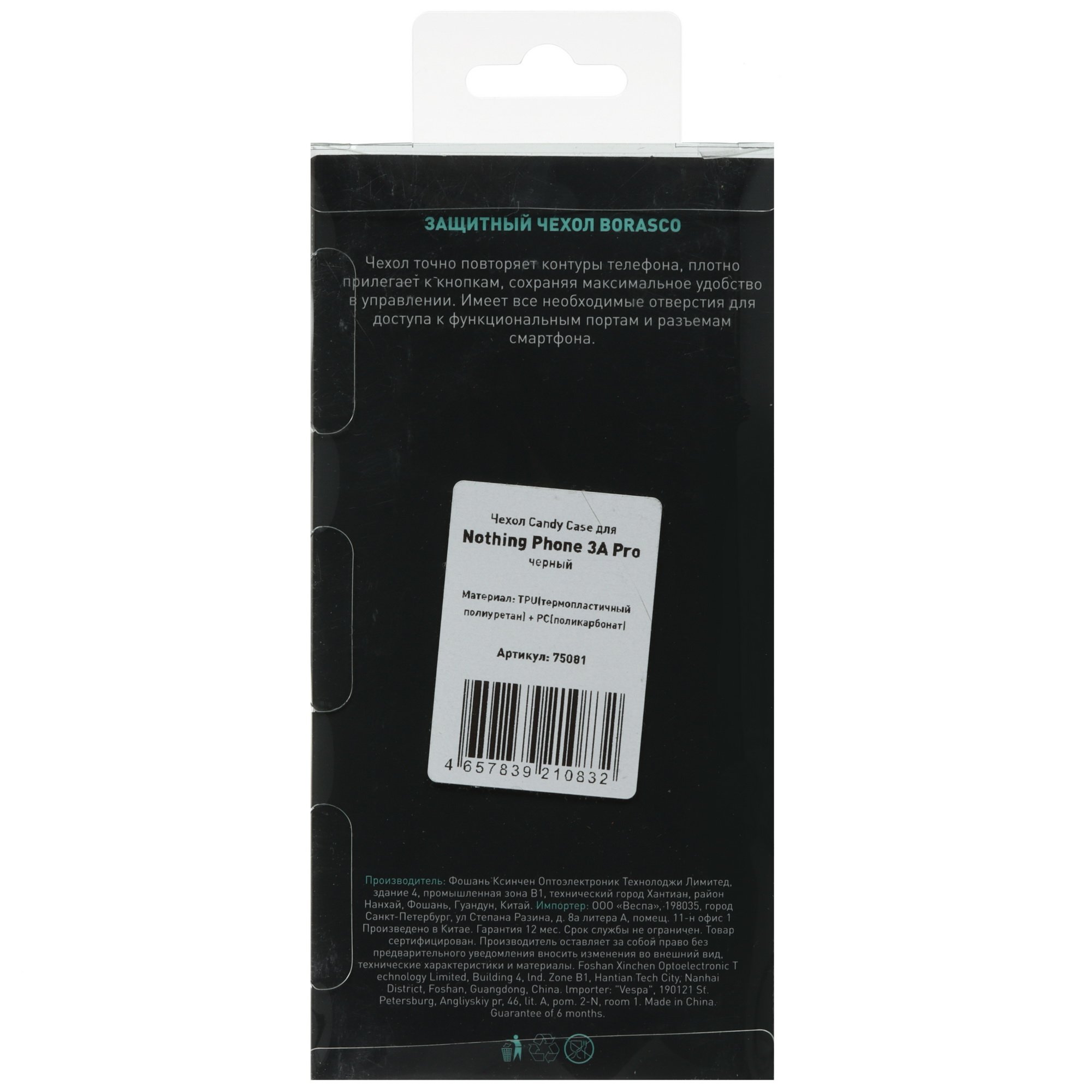 Накладка BoraSCO Candy Case для Nothing Phone 3A Pro черного цвета изготовлена из поликарбоната и термопластичного полиуретана. Аксессуар предотвращает загрязнения и механические повреждения боковых граней и задней панели корпуса смартфона Nothing Phone 3A Pro.