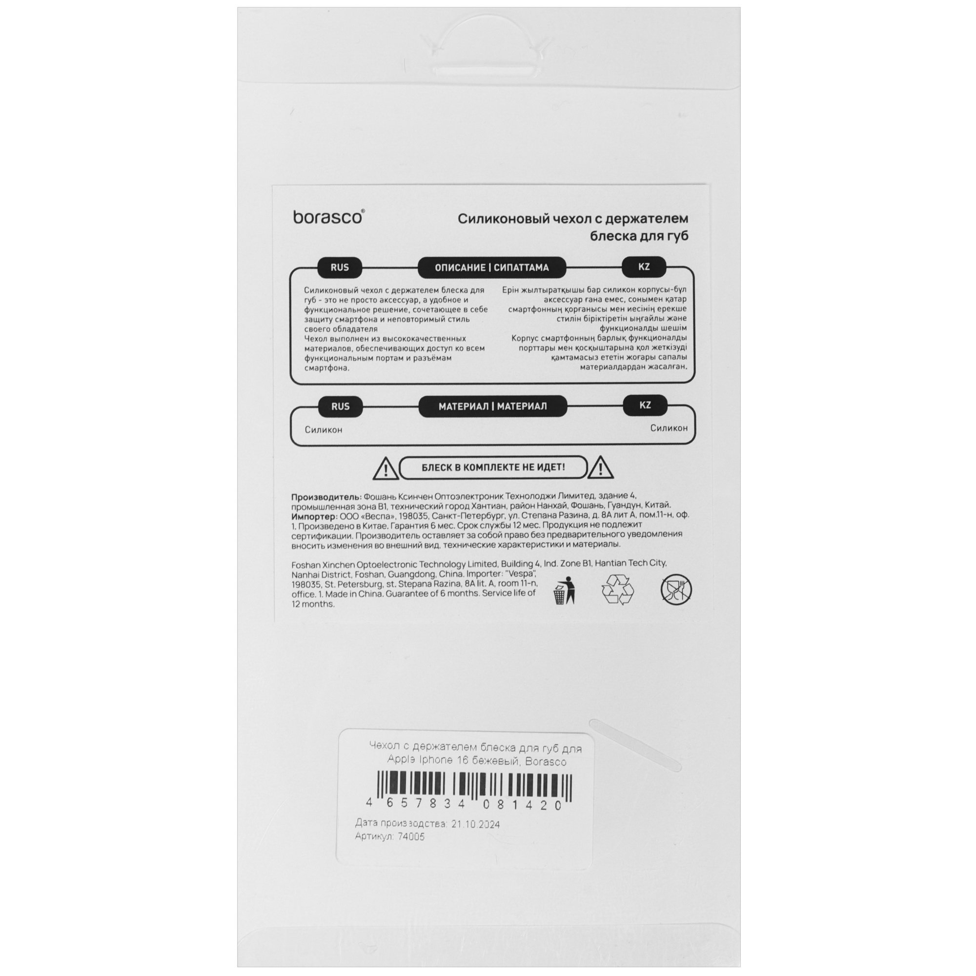 Благодаря амортизационным свойствам материала сохраняется целостность корпуса при ударах и падениях. Мягкая поверхность приятна на ощупь и просто очищается от загрязнений. В конструкции накладки BoraSCO предусмотрен держатель блеска для губ на тыловой стороне.