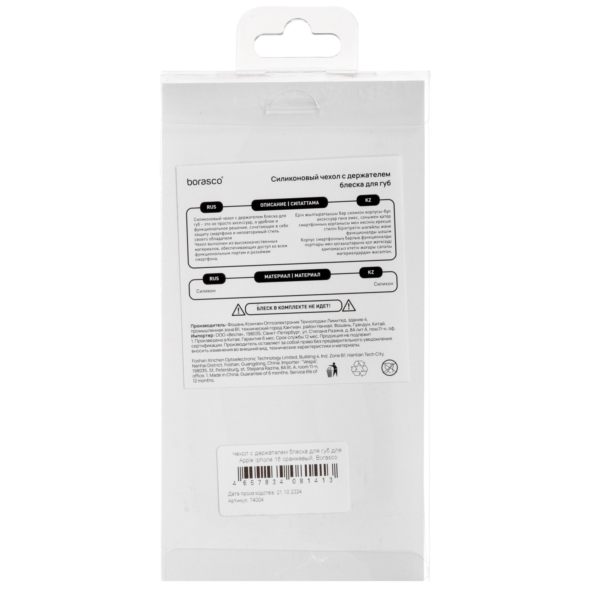 Благодаря амортизационным свойствам материала сохраняется целостность корпуса при ударах и падениях. Мягкая поверхность приятна на ощупь и просто очищается от загрязнений. В конструкции накладки BoraSCO предусмотрен держатель блеска для губ на тыловой стороне.