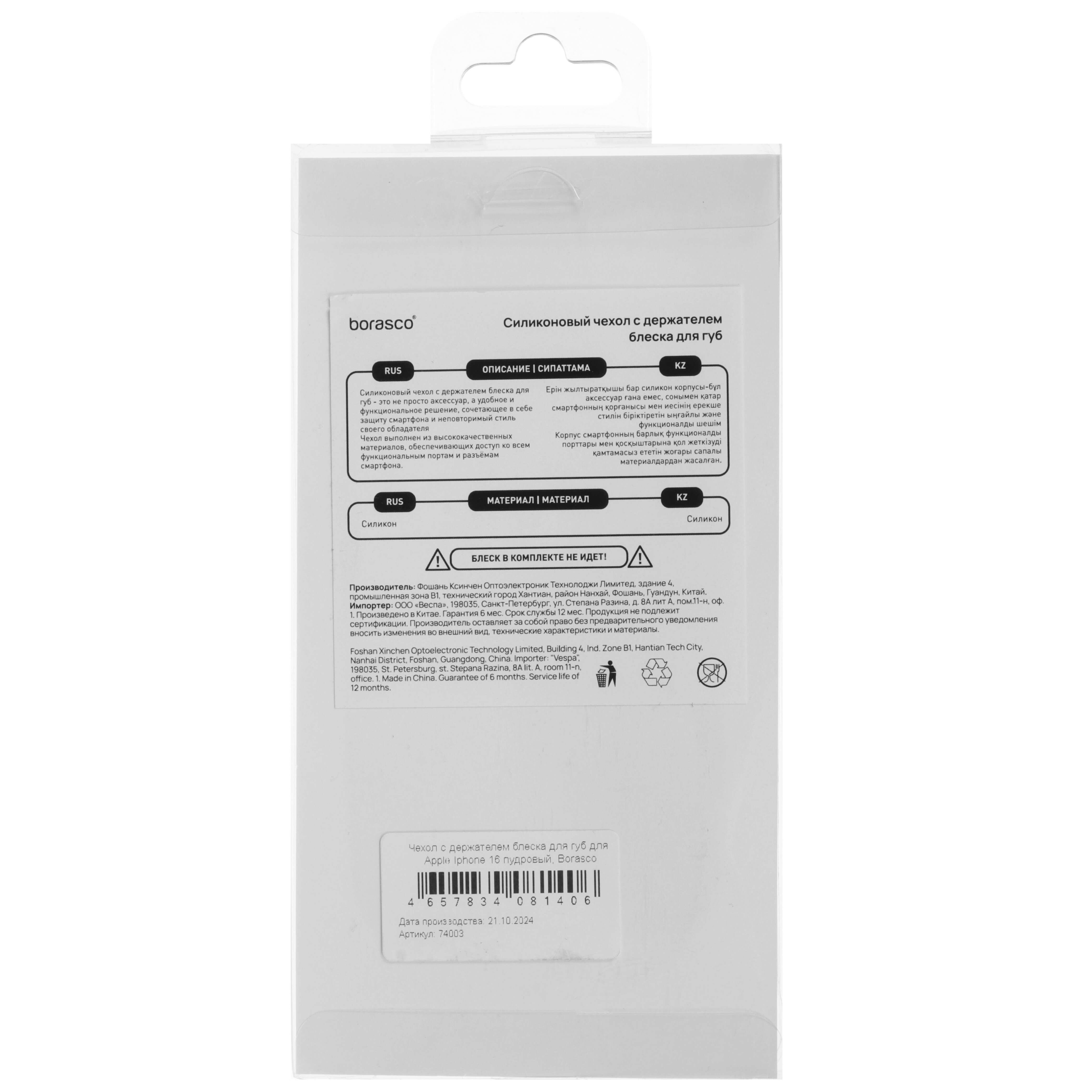 Благодаря амортизационным свойствам материала сохраняется целостность корпуса при ударах и падениях. Мягкая поверхность приятна на ощупь и просто очищается от загрязнений. В конструкции накладки BoraSCO предусмотрен держатель блеска для губ на тыловой стороне.
