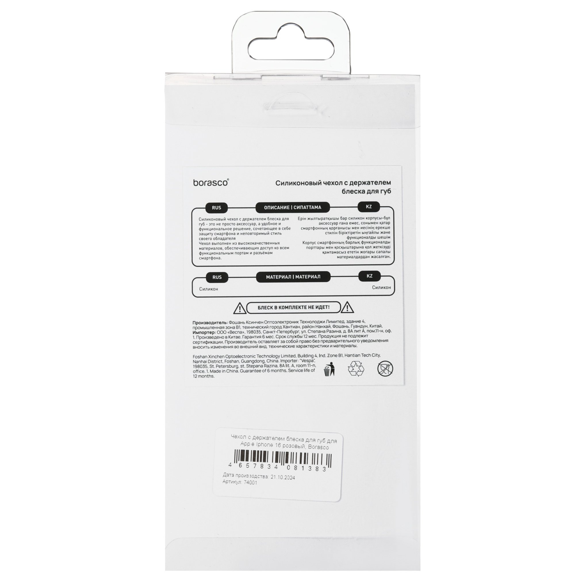 Благодаря амортизационным свойствам материала сохраняется целостность корпуса при ударах и падениях. Мягкая поверхность приятна на ощупь и просто очищается от загрязнений. В конструкции накладки BoraSCO предусмотрен держатель блеска для губ на тыловой стороне.