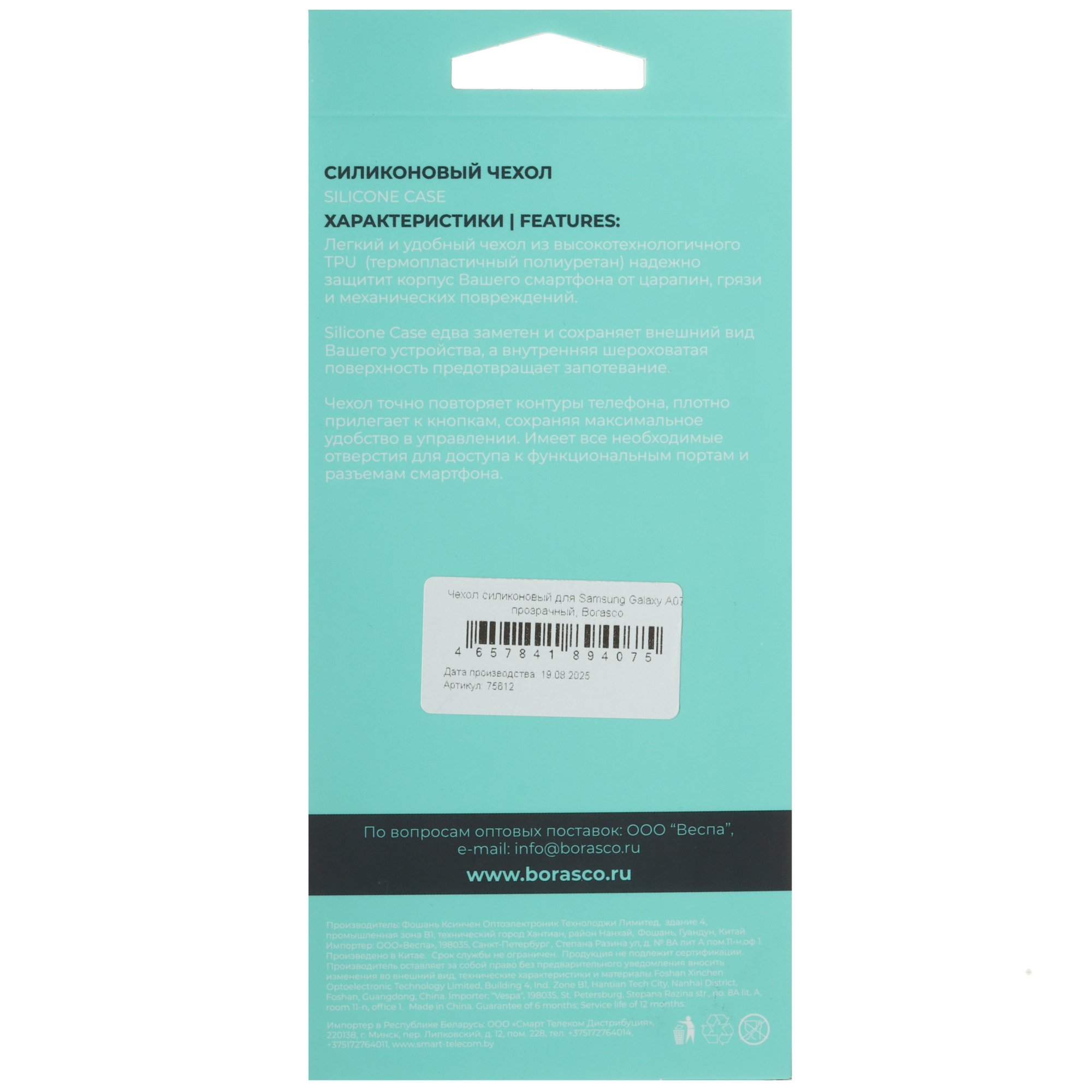 Накладка BoraSCO для Samsung Galaxy A07 с диагональю экрана 6.7 дюйма защищает корпус смартфона от повреждений и загрязнений. Прозрачный чехол изготовлен из гибкого термопластичного полиуретана. Благодаря амортизационным свойствам материала он сохраняет целостность корпуса при ударах и несильных падениях. В накладке BoraSCO предусмотрены выступы под кнопки управления и отверстия для свободного доступа к функциональным разъемам. Мягкая поверхность обеспечивает приятные тактильные ощущения и комфортное удержание смартфона.