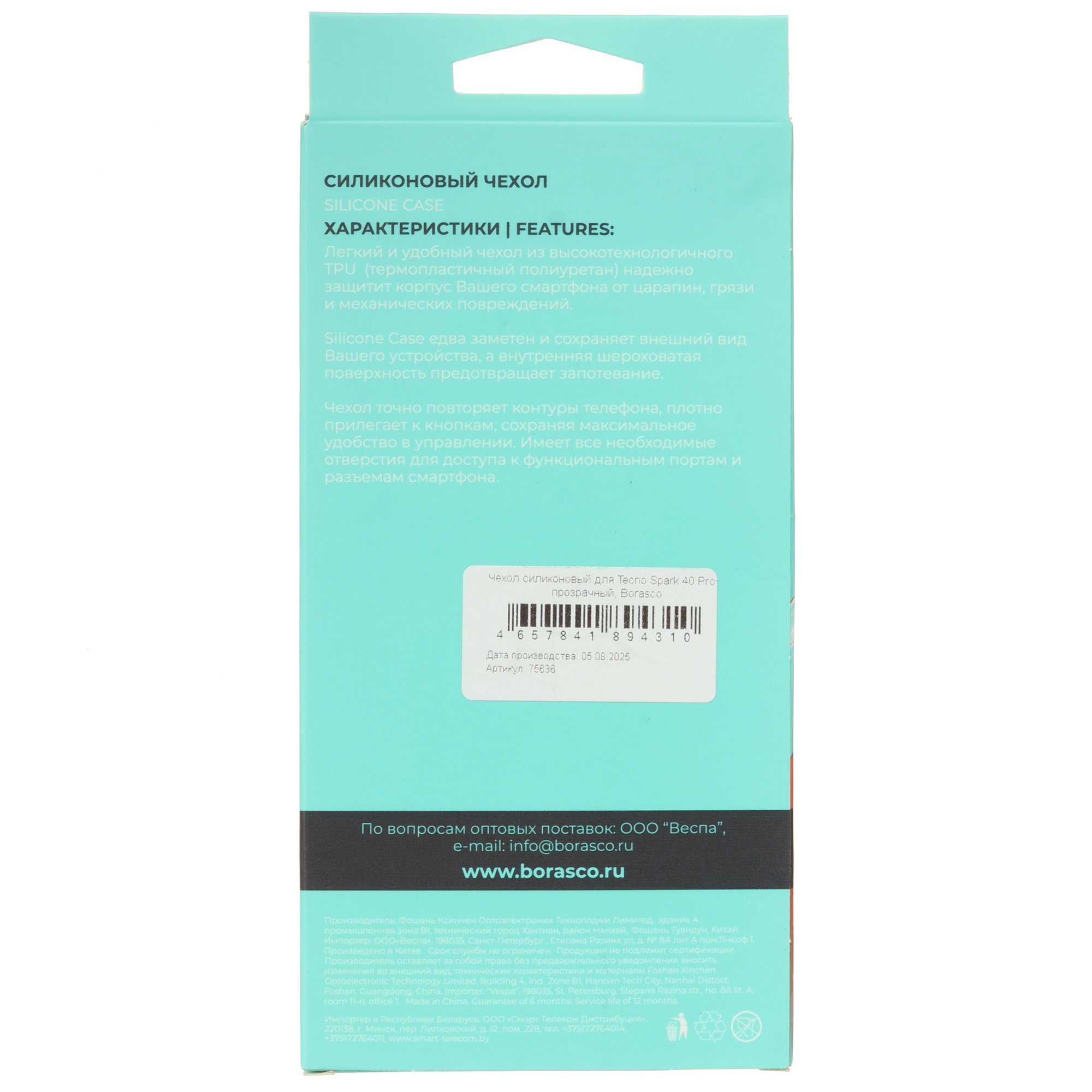 Накладка BoraSCO для Tecno SPARK 40 Pro+ прозрачная предназначена для защиты смартфона Tecno SPARK 40 Pro+ от капель воды, царапин, потертостей. Чехол закрывает всю заднюю часть корпуса и боковые грани. В нем есть все необходимые вырезы под камеру и кабели.