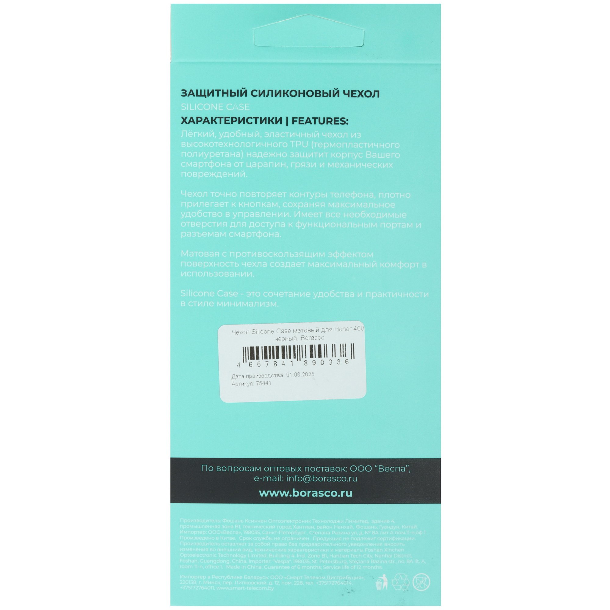 Накладка BoraSCO Silicone Case для HONOR 400 черного цвета защищает смартфон HONOR 400 от пыли и грязи. Чехол закрывает всю заднюю панель и боковые грани, предотвращает появление на корпусе царапин, потертостей и сколов во время эксплуатации устройства. В модели предусмотрены технологические вырезы под зарядку, камеру, провод для наушников.