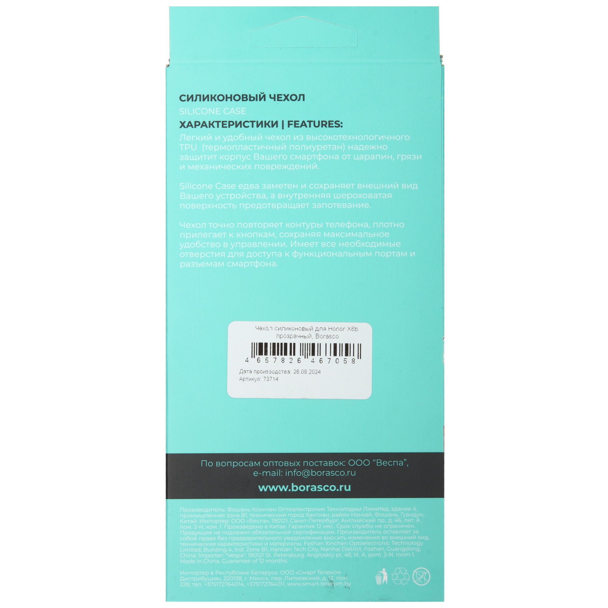 Накладка BoraSCO для Honor X6b в прозрачном исполнении предназначена для фиксации на корпусе вашего смартфона. Благодаря этому плотно прилегающему к корпусу защитному средству мобильное устройство получает защиту от царапин, загрязнений и несильных ударов. Чехол изготавливается из износостойкого материала – термопластичного полиуретана, и выдерживает длительную эксплуатацию без утраты защитных свойств. Он достаточно легок и тонок, чтобы вы могли с комфортом пользоваться смартфоном.