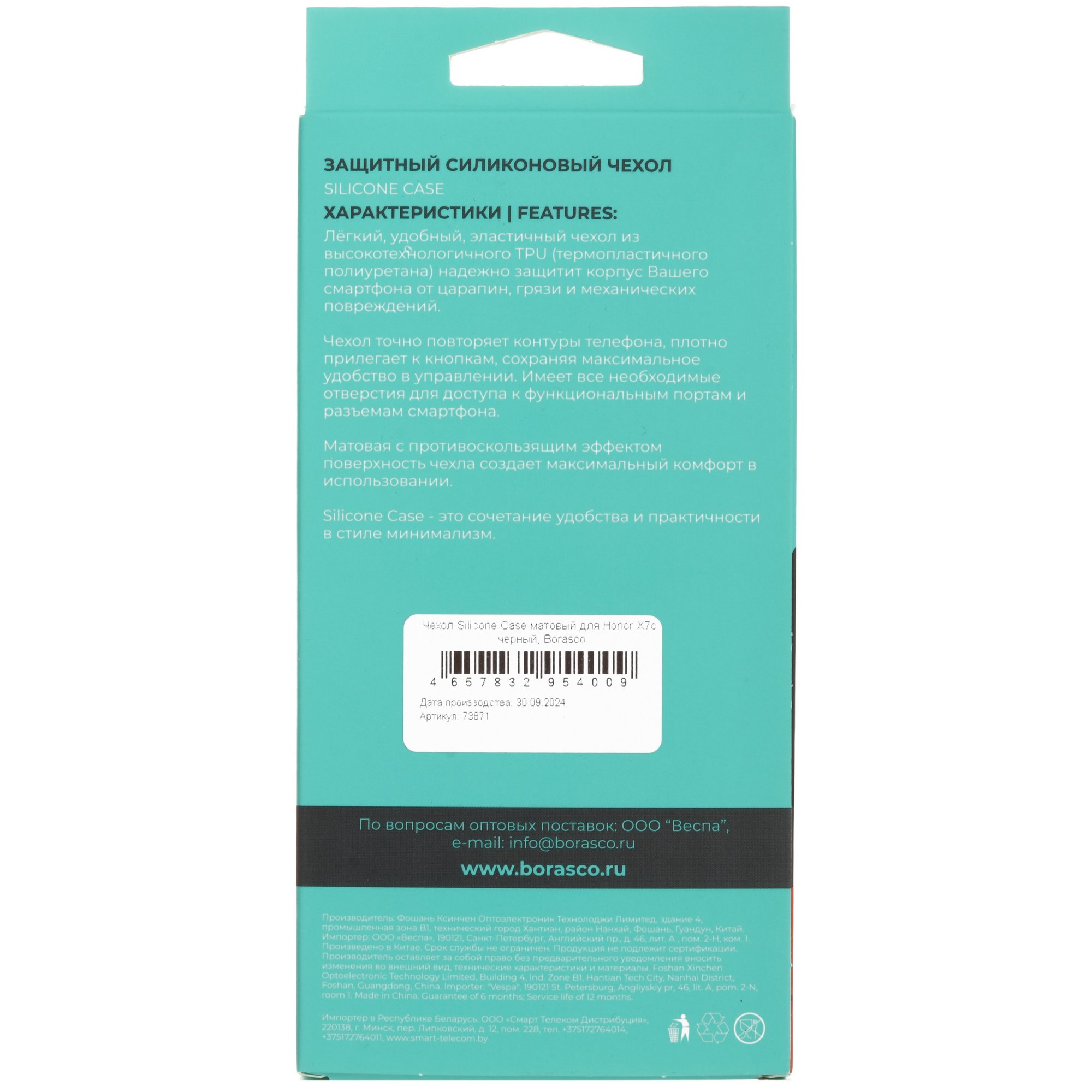 Накладка BoraSCO 73871 подходит для эксплуатации со смартфоном HONOR X7c. Аксессуар выполнен из черного термопластичного полиуретана, который отличает устойчивость к износу и легкость при удалении загрязнений.