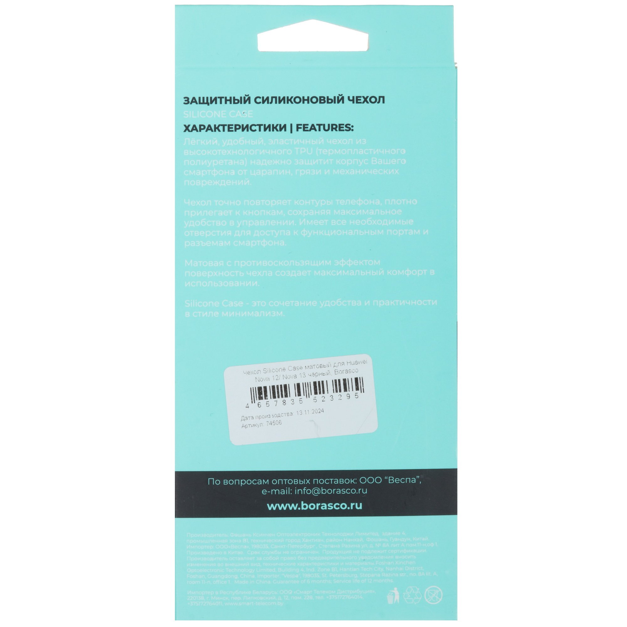 BoraSCO оснащена набором отверстий для свободного доступа к основной камере и разъемам устройства HUAWEI nova 12/ nova 13. Аксессуар не скользит при удержании в перчатке или влажной ладони. Устойчивая к растяжению накладка сохраняет исходную форму и точно прилегает к корпусу даже после частого снятия для очистки от загрязнений.