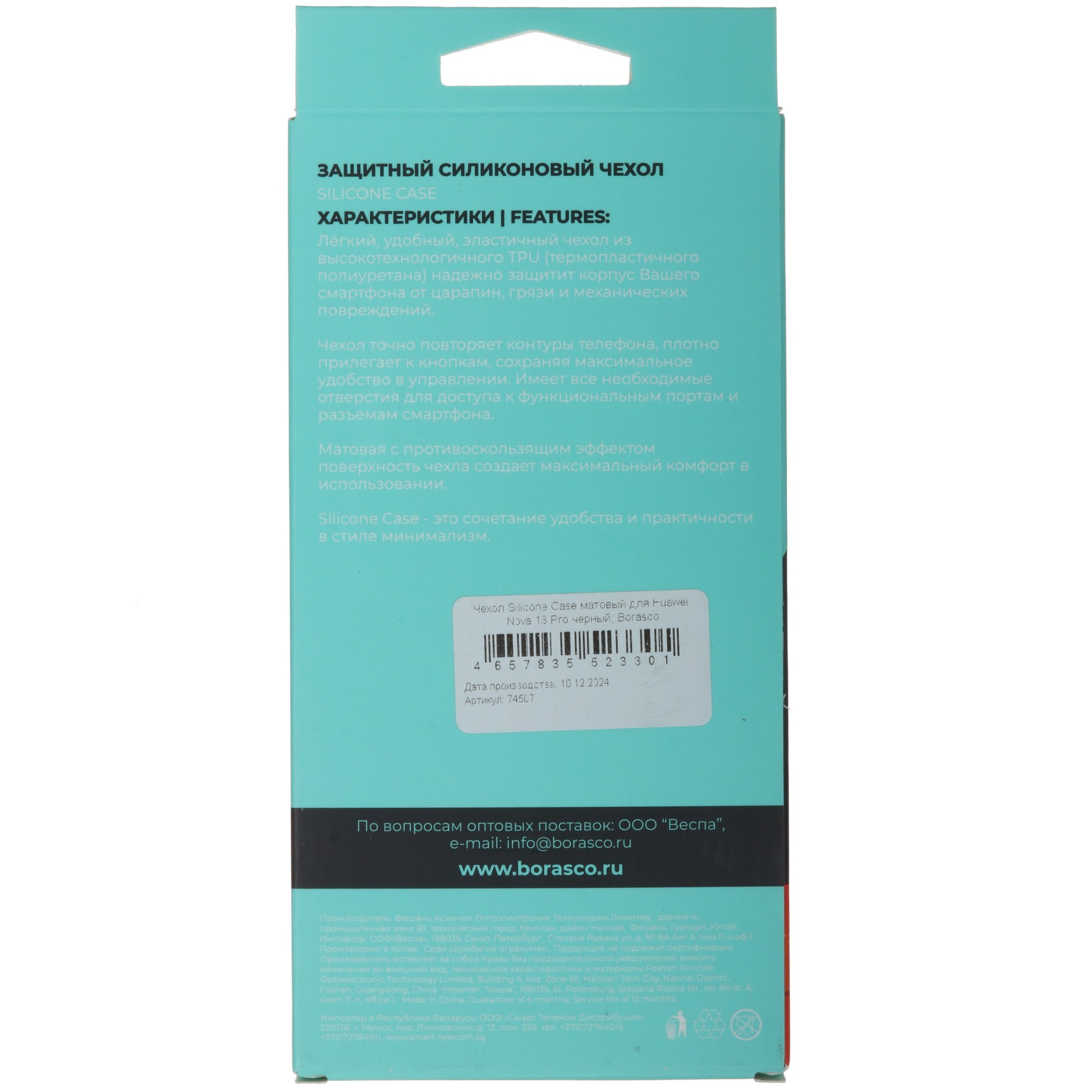 Черная однотонная накладка BoraSCO для HUAWEI nova 13 Pro выполнена из простого в уходе и эластичного силикона. Аксессуар точно повторяет контуры устройства, не царапает и защищает поверхность от попадания брызг и пыли. Накладка амортизирует удары и тем самым уменьшает риск появления сколов и других поломок при случайном падении смартфона.