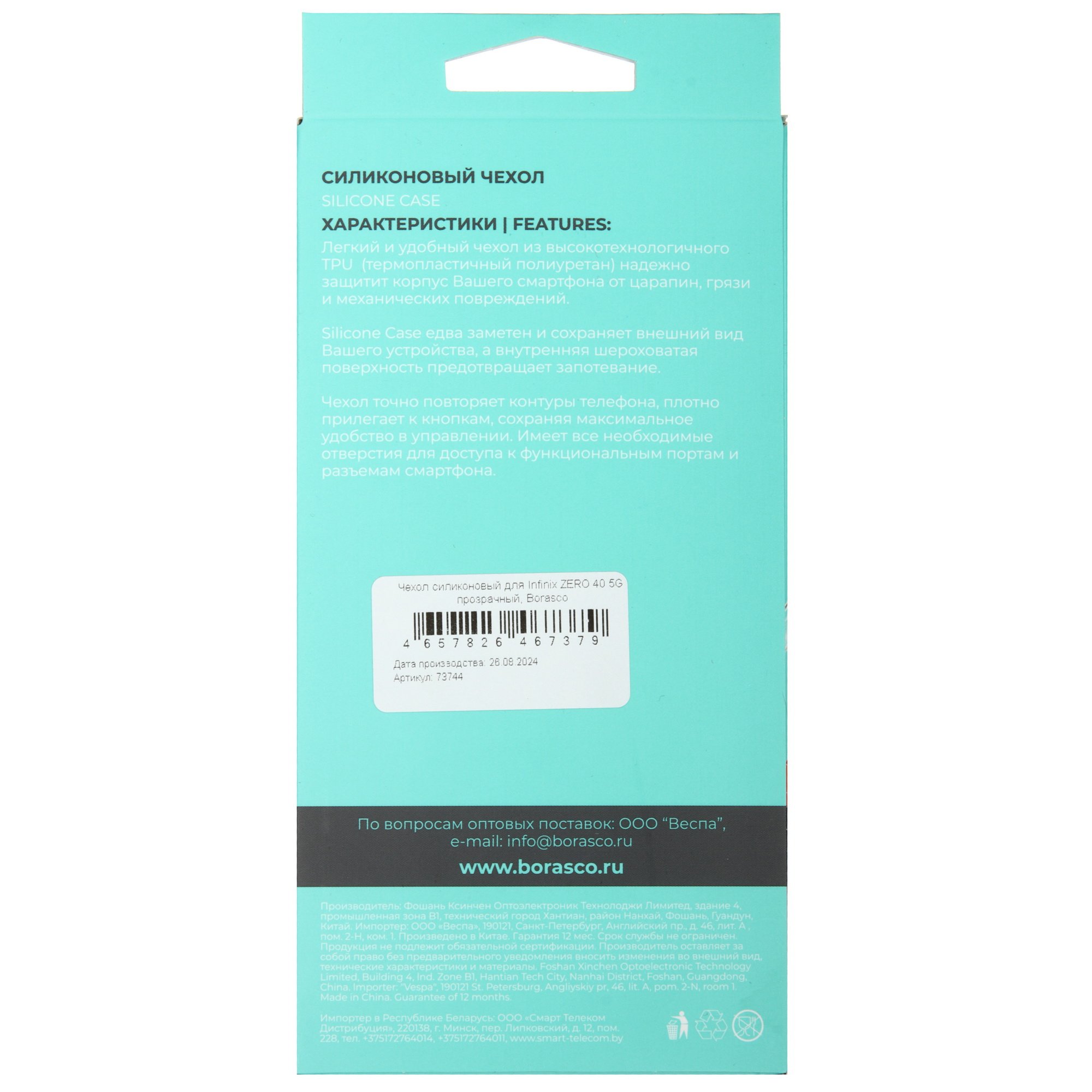 Накладка BoraSCO для Infinix ZERO 40 5G сделана из силикона ТПУ. Этот материал плотный и прочный, эластичный и не разорвется при растягивании, не выгорает на солнце и выдерживает высокие температуры. Чехол мягкий и гибкий, легко устанавливается и снимается, а грязь и пыль с его поверхности можно убрать влажной салфеткой.
