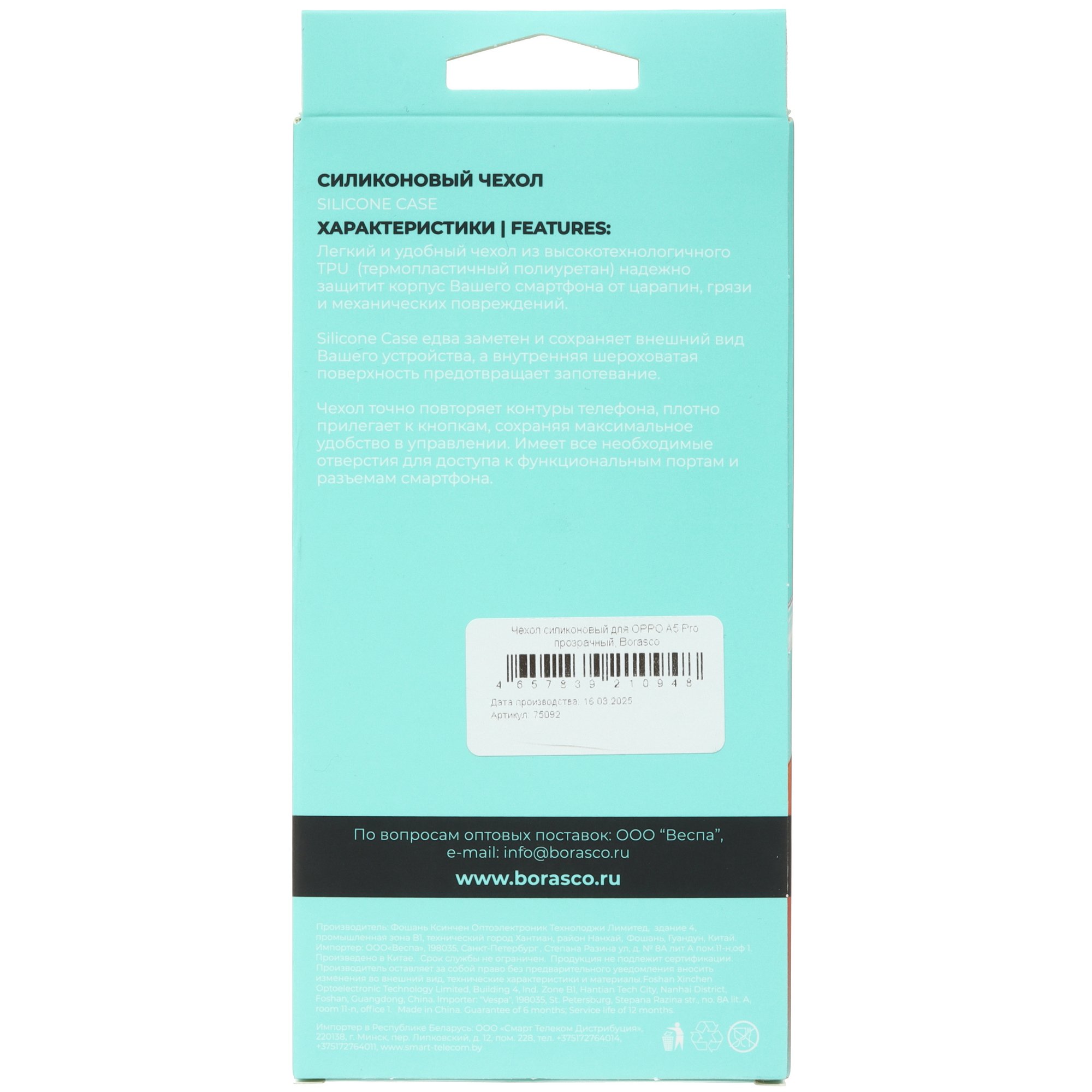 Накладка BoraSCO Silicone Case для OPPO A5 Pro сделана из силикона ТПУ. Этот материал пластичный и обладает амортизацией. Он частично гасит силу удара при падении смартфона на твердую поверхность и предотвращает его поломку. Благодаря легкому весу чехол не утяжеляет телефон.
