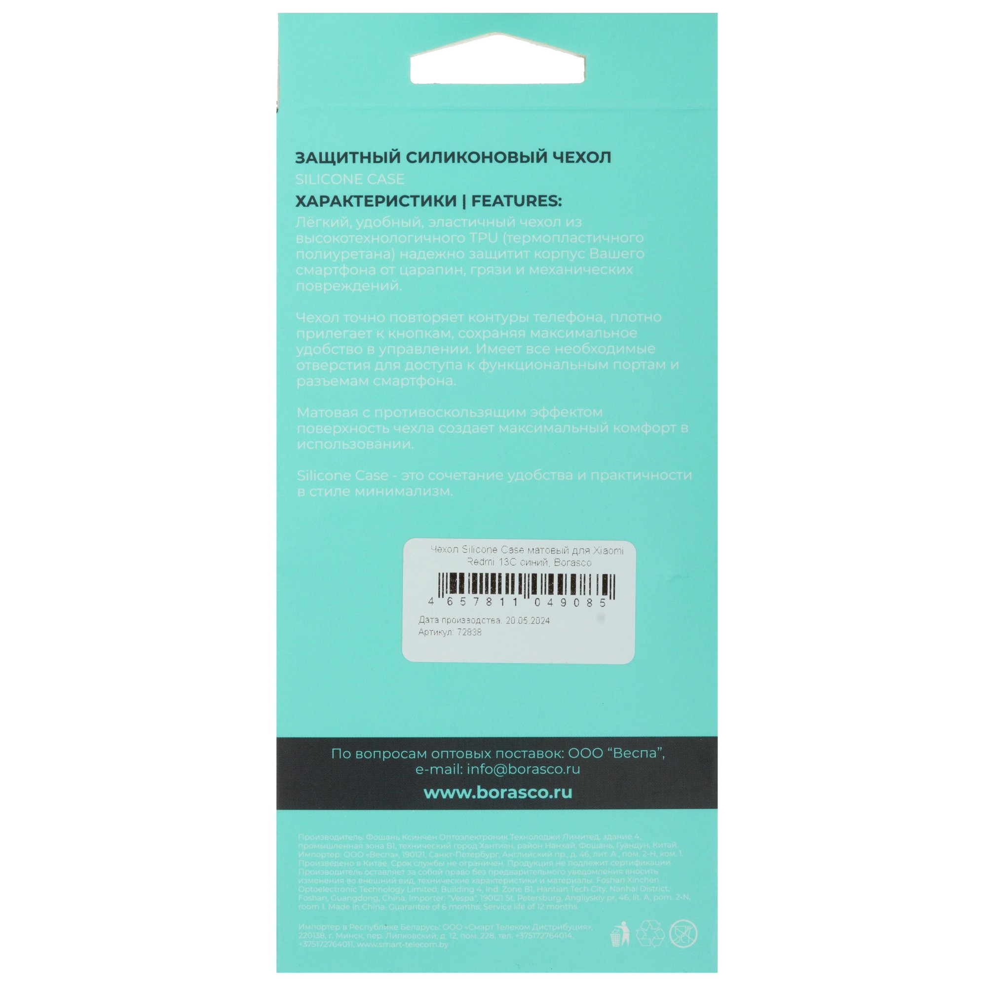 Накладка BoraSCO 72838 подходит для эксплуатации со смартфонами POCO C65, Xiaomi Redmi 13C. Аксессуар выполнен из синего термопластичного полиуретана, который отличает устойчивость к износу и легкость при удалении загрязнений.
