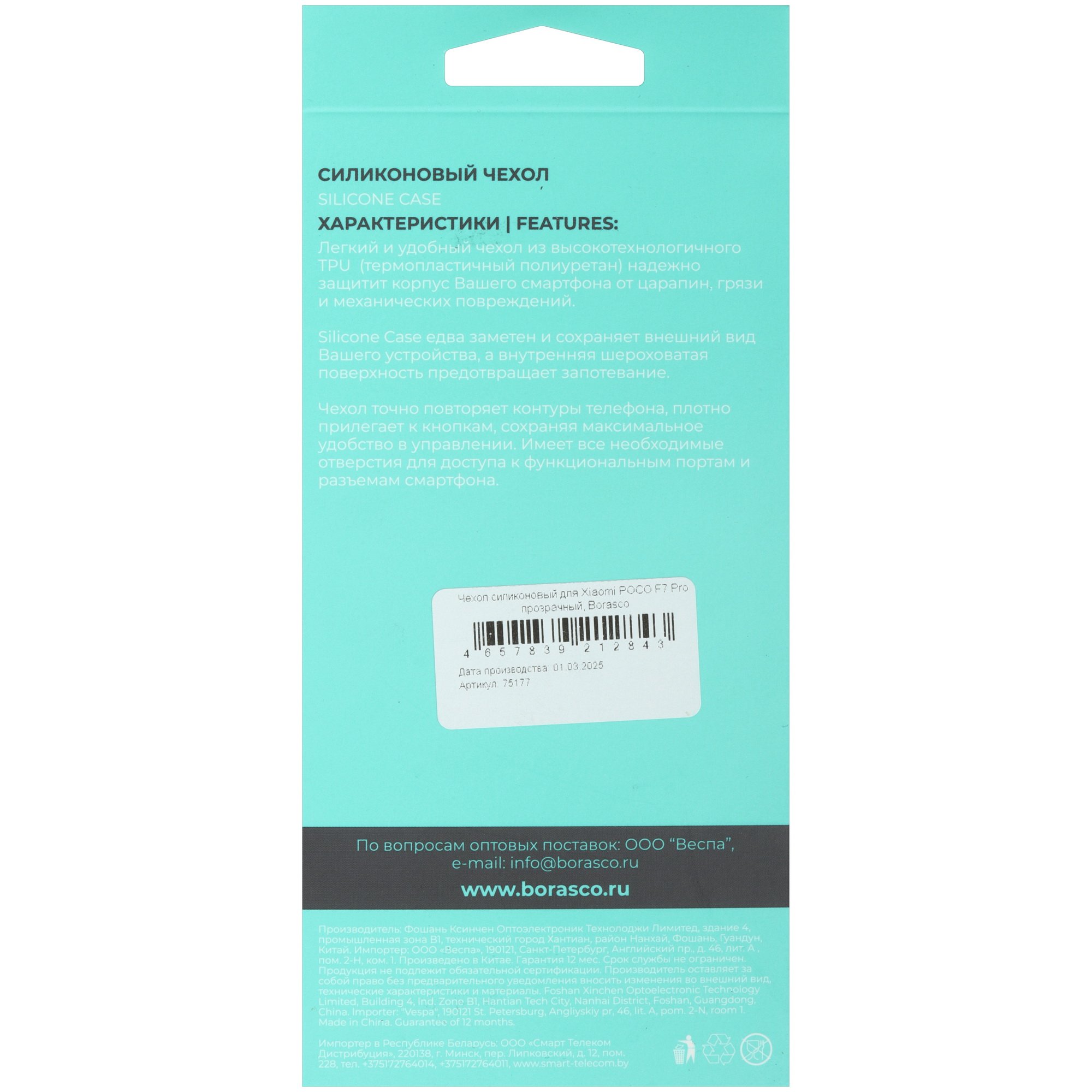Накладка BoraSCO Silicone Case для POCO F7 Pro прозрачная обеспечивает защиту задней панели и боковых граней смартфона от царапин и ударов. Чехол совместим с моделью POCO F7 Pro. На нем есть все необходимые отверстия: под зарядный кабель, камеру, наушники.