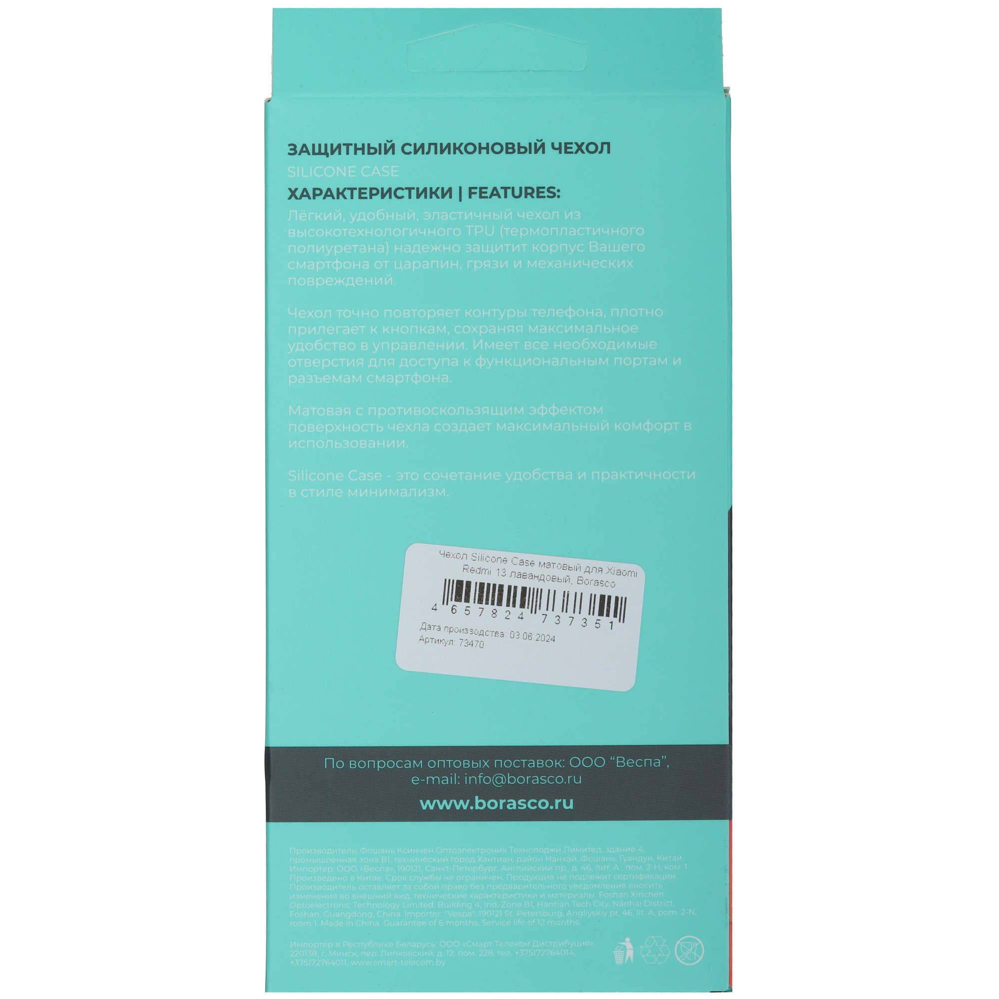 Накладка BoraSCO для POCO M6/ Xiaomi Redmi 13 сделана из силикона ТПУ. Этот материал плотный и прочный, эластичный и не разорвется при растягивании, не выгорает на солнце и выдерживает высокие температуры. Чехол мягкий и гибкий, легко устанавливается и снимается, а грязь и пыль с его поверхности можно убрать влажной салфеткой.