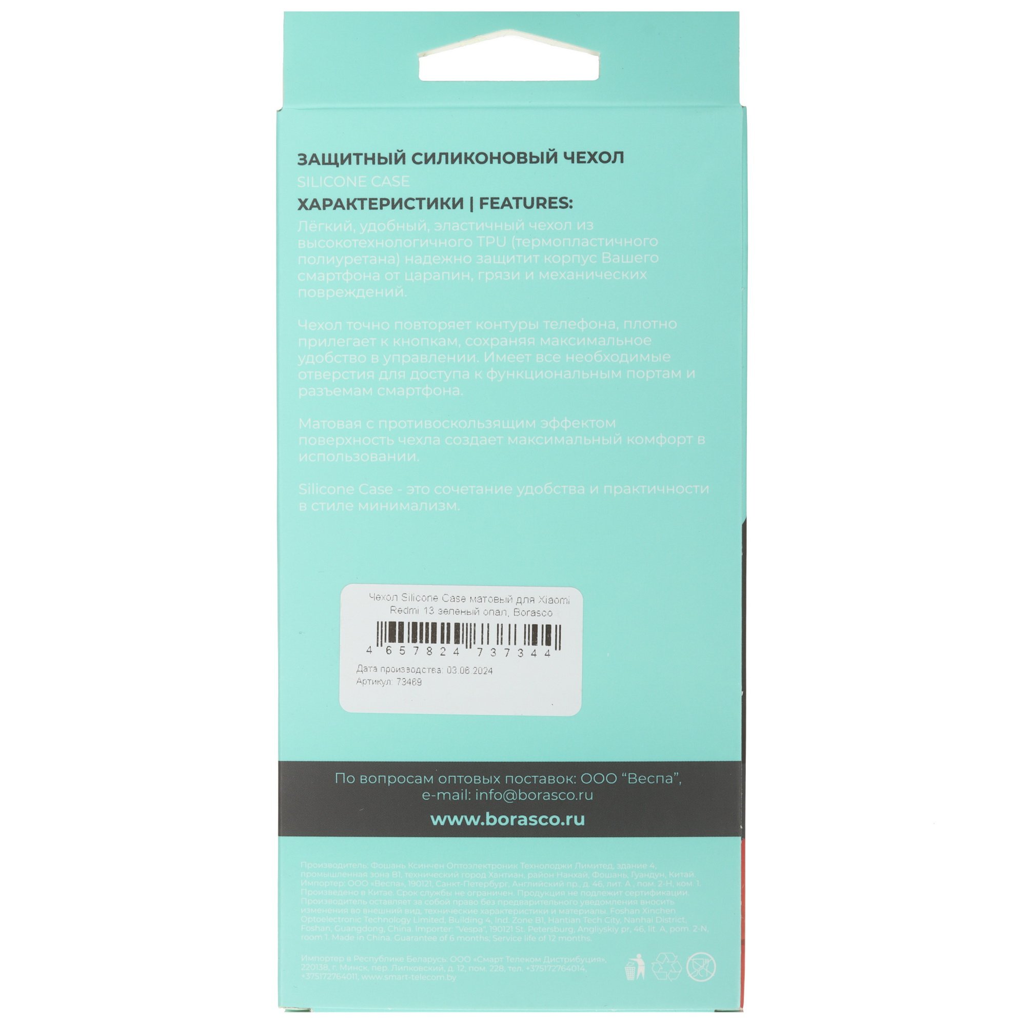 Накладка BoraSCO 73469 подходит для эксплуатации со смартфонами POCO M6, Xiaomi Redmi 13. Аксессуар выполнен из зеленого термопластичного полиуретана, который отличает устойчивость к износу и легкость при удалении загрязнений.