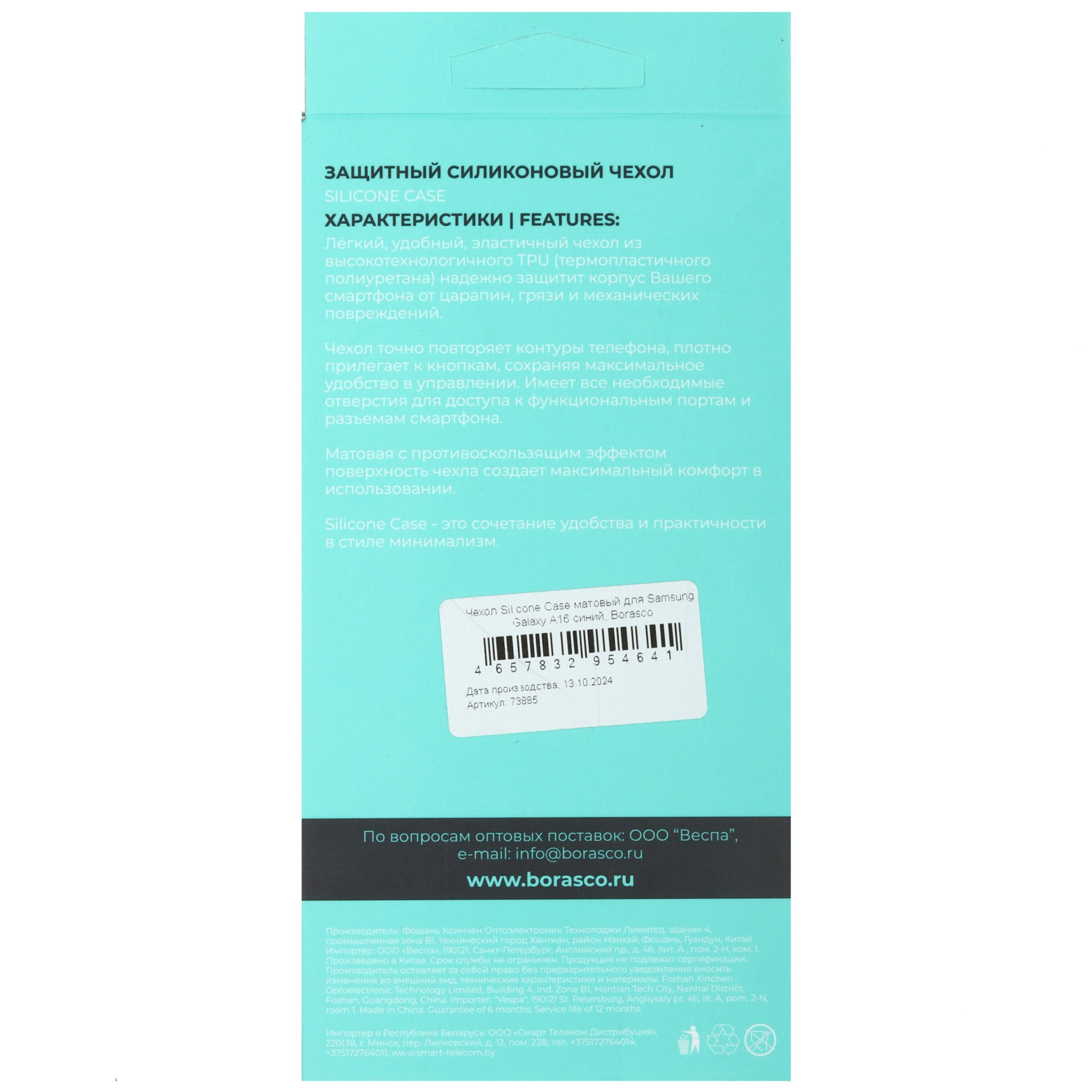 Синяя однотонная накладка BoraSCO для Samsung Galaxy A16 выполнена из простого в уходе и эластичного силикона. Аксессуар точно повторяет контуры устройства, не царапает и защищает поверхность от попадания брызг и пыли. Накладка амортизирует удары и тем самым уменьшает риск появления сколов и других поломок при случайном падении смартфона.