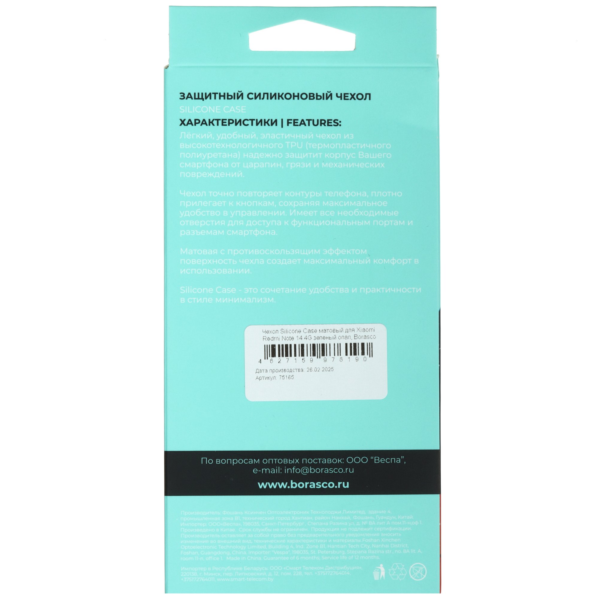Накладка BoraSCO Silicone Case для Xiaomi Redmi Note 14 зеленого предназначена для защиты смартфона Xiaomi Redmi Note 14 от капель воды, царапин, потертостей. Чехол закрывает всю заднюю часть корпуса и боковые грани. В нем есть все необходимые вырезы под камеру и кабели.