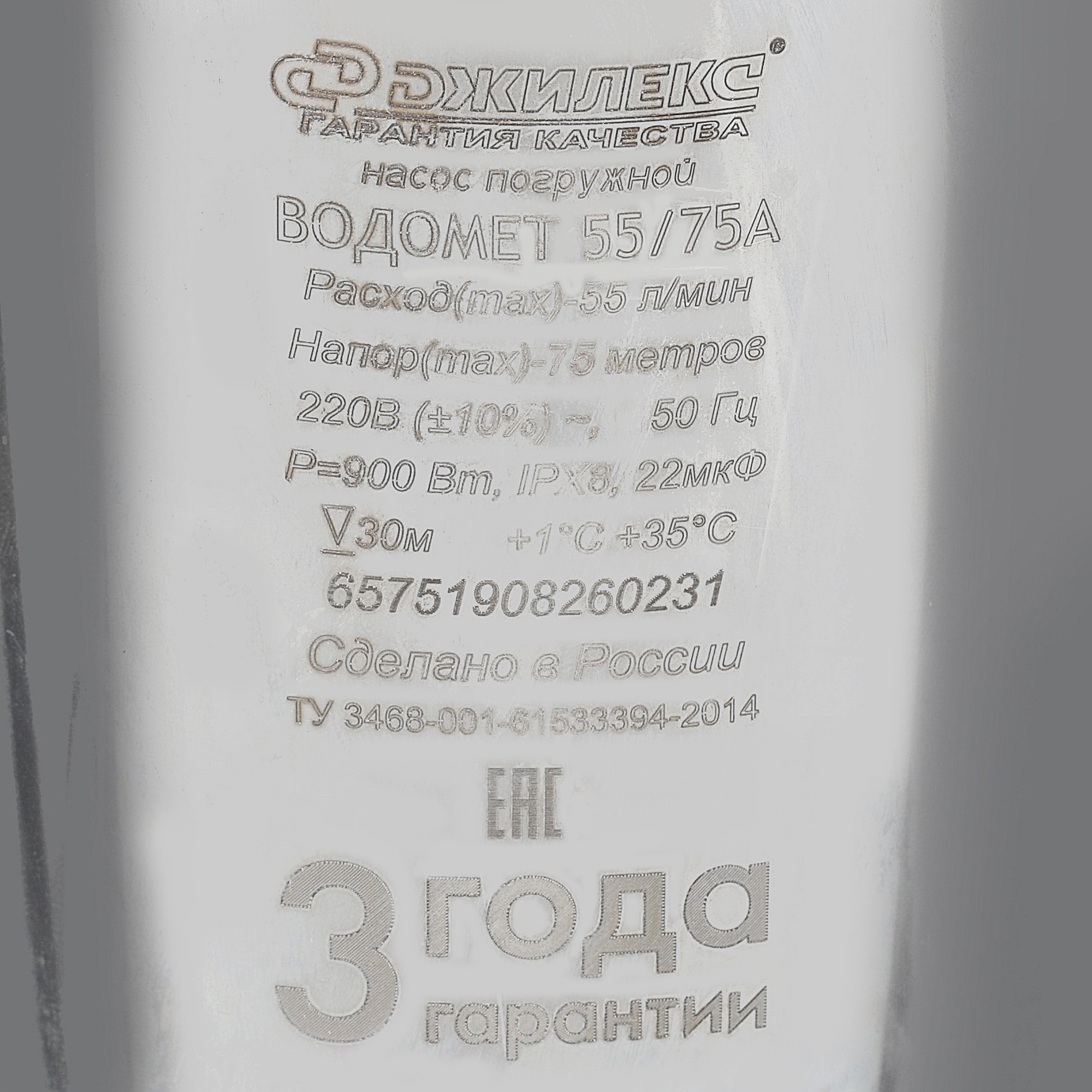 Джилекс ВОДОМЕТ 55/75 А потребляет до 900 Вт электроэнергии, выдает до 55 литров воды в минуту и работает от центробежного механизма, с пропускной способностью - 3.3 м³/ч. Изготавливается из нержавеющей стали. Максимальная глубина забора воды – 30 метров, при этом, подъем воды составляет – 75 метров. Не допускать работу с водой, температура которой превышает +35°.