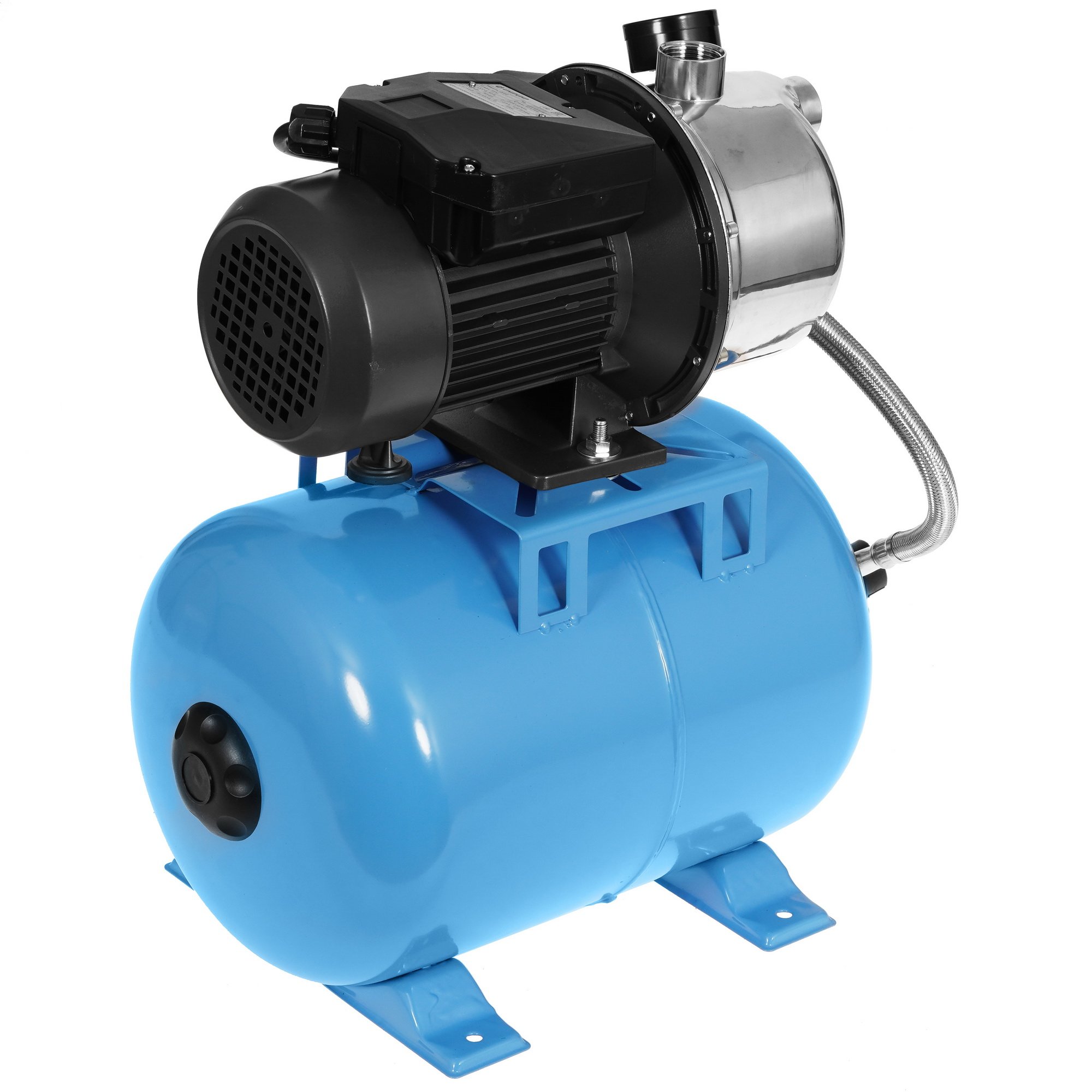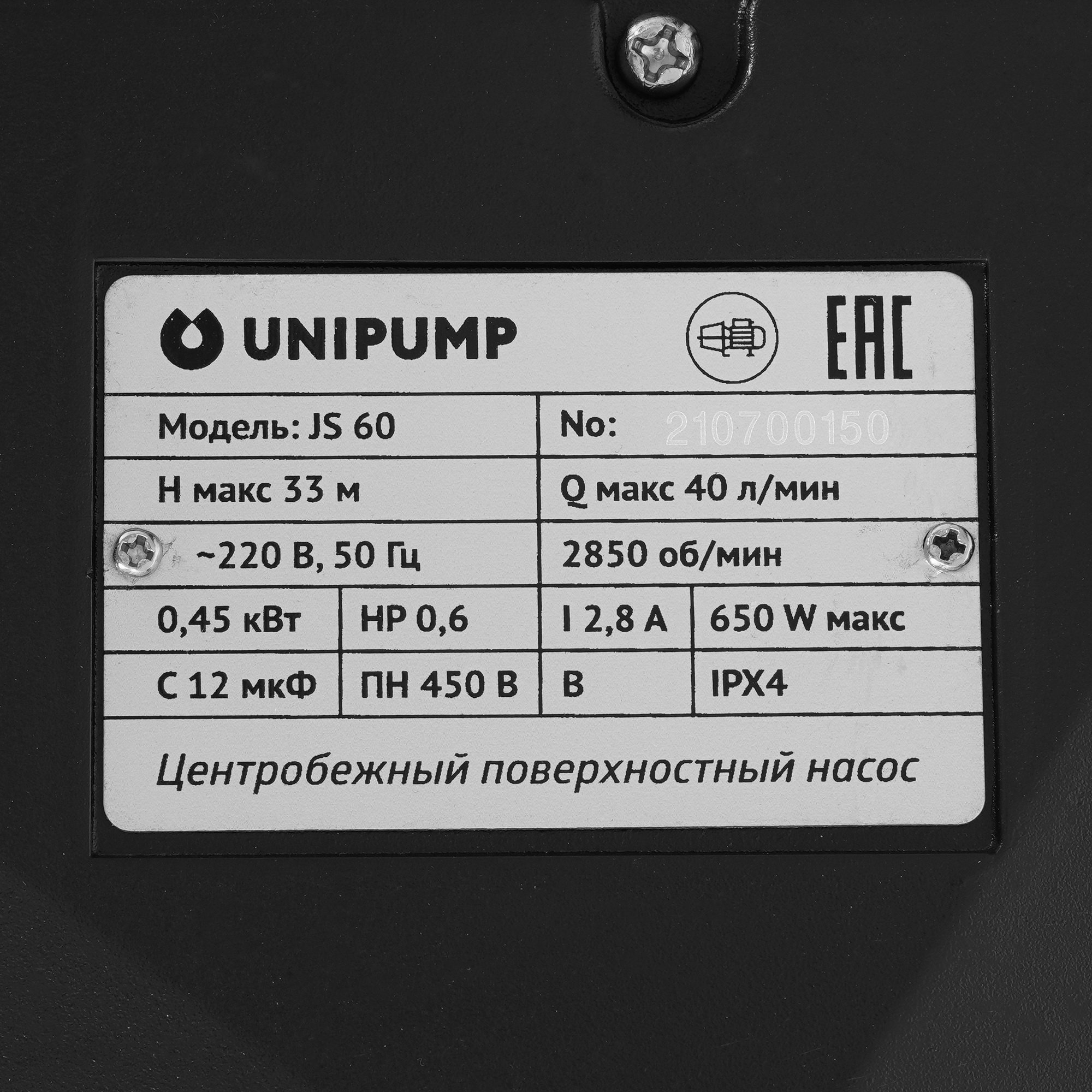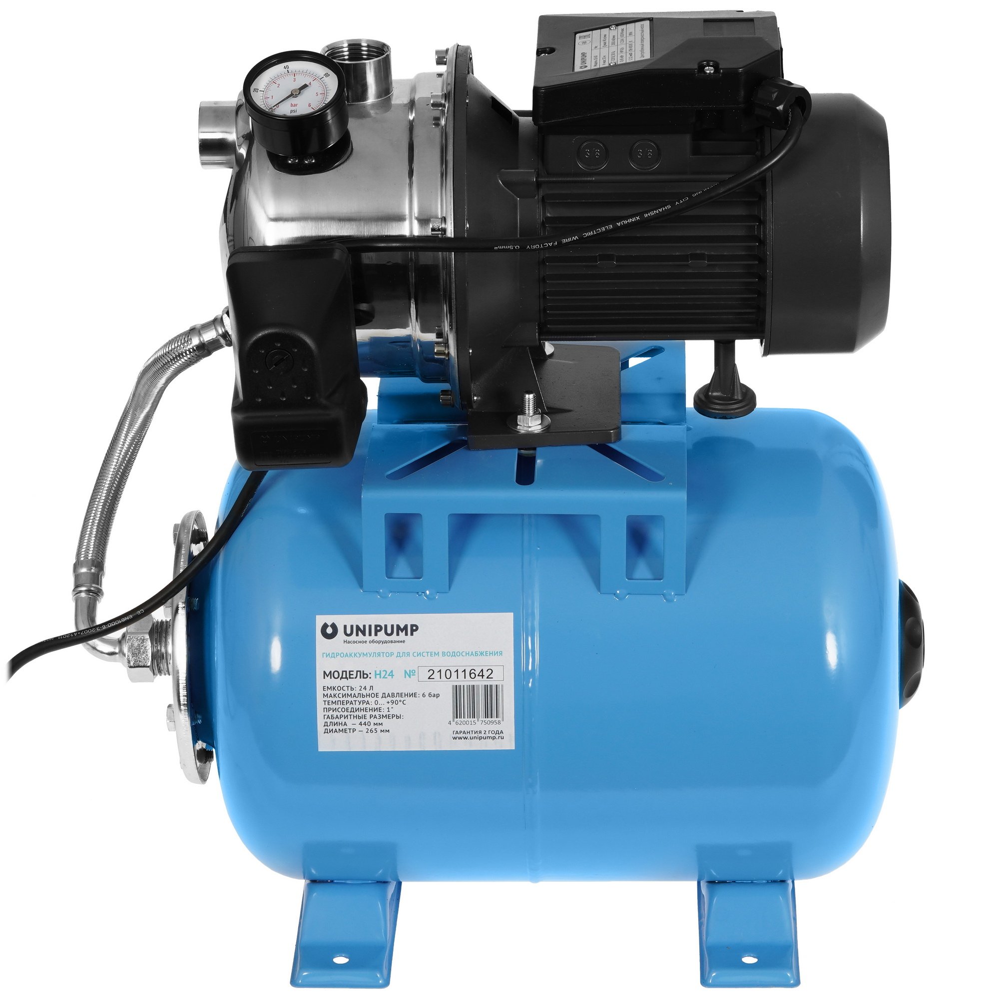 В основе Unipump AUTO JS 60 лежит центробежный насос, расположенный на поверхности. Благодаря гидроаккумулятору объемом 24 л аппарат обеспечивает непрерывную подачу воды. В нем хранится хороший запас воды. При опустошении бака и падении давления до минимального значения реле подает сигнал о необходимости включения насоса. Когда показатель давления достигает максимального порога устройство отключается.