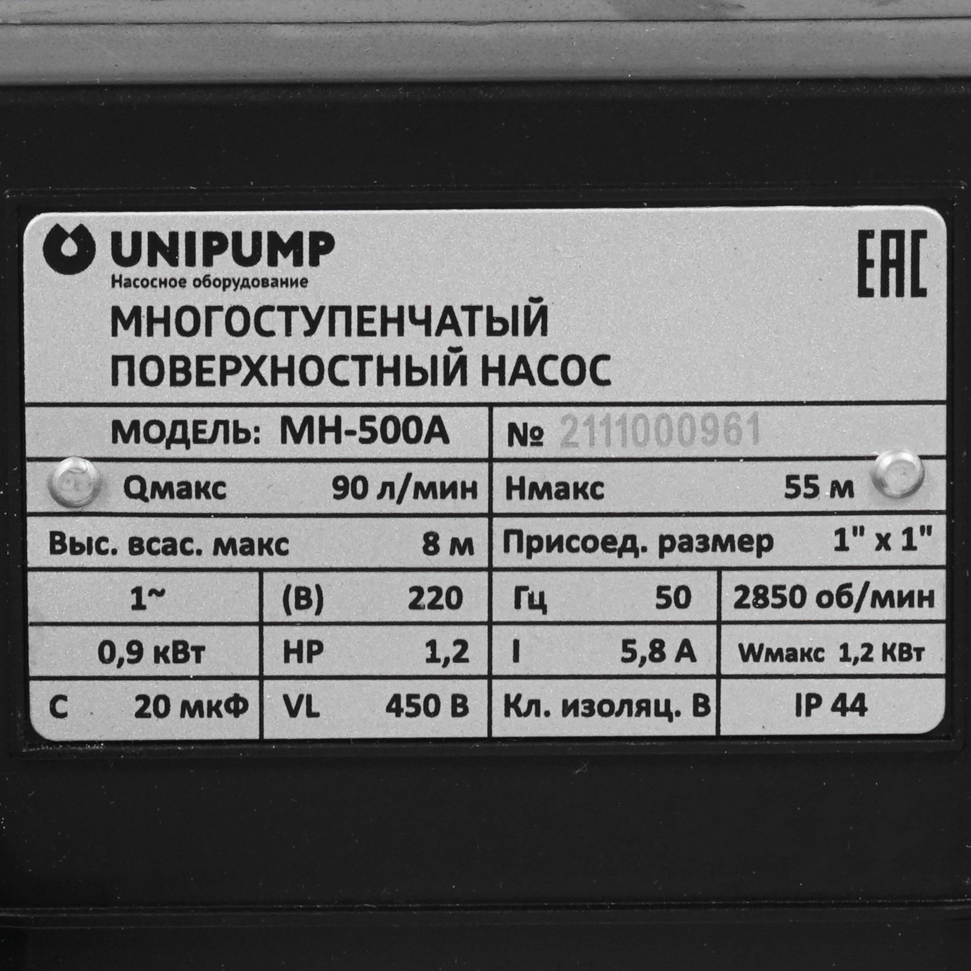 Unipump AUTO MH 500 A работает на основе центробежного многоступенчатого насоса. При падении уровня воды в гидробаке снижается и давление в нем. Это подает сигнал реле для включения электронасоса. Когда с прибытием воды в бак уровень давления повышается до максимальной отметки, реле отключает насос. Манометр, установленный в верхней части корпуса, помогает отслеживать показатели давления.