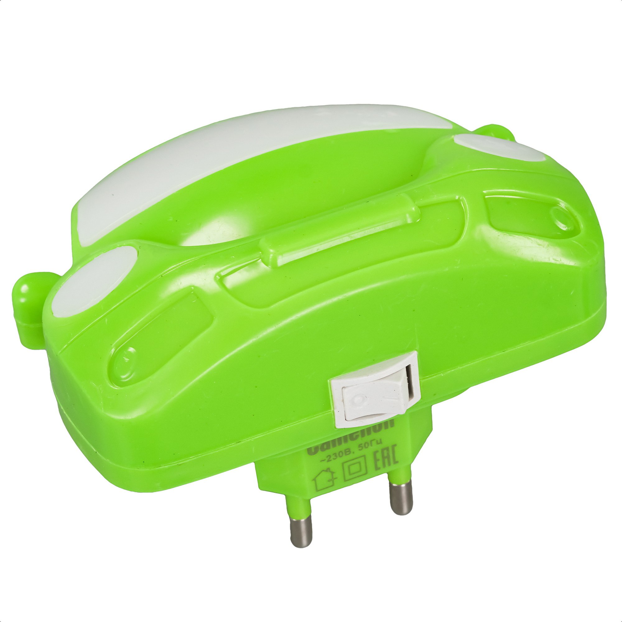 Ночник Camelion NL-197 с корпусом из зеленого пластика в виде машинки выдает рассеянный мягкий свет. Декоративный светильник с матовыми рассеивателями успокаивает ребенка, позволяя ему спокойнее засыпать одному в комнате и вставать по ночам. Этот осветительный прибор для детской комнаты располагает внешней вилкой и устанавливается прямо в розетку бытовой электросети. Он предполагает работу при напряжении на входе 230 В и частоте тока 50 Гц.