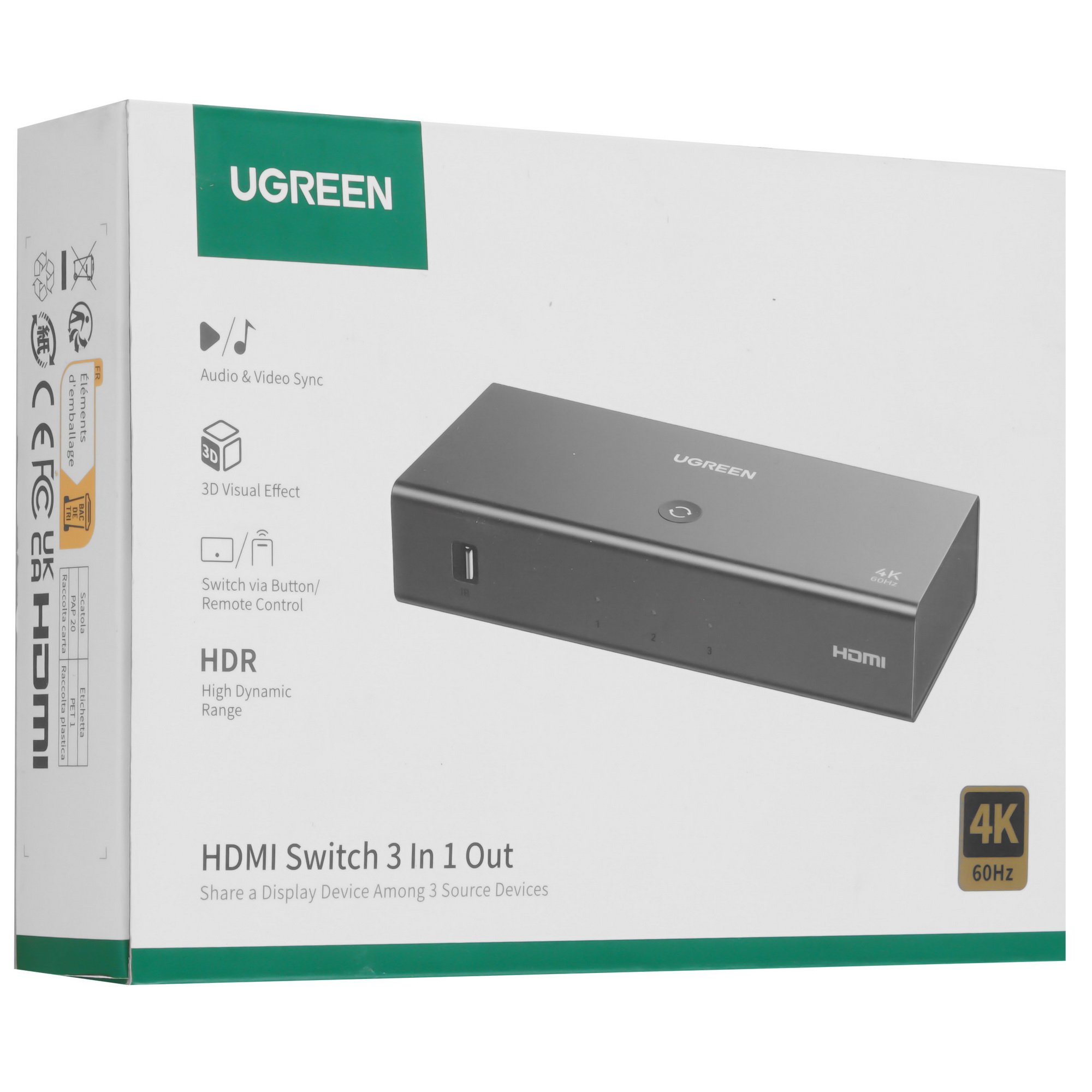 Переключатель Ugreen CM598 используется для передачи видеосигнала и звука. Устройство оснащено 3 входами HDMI. На выходе расположен порт HDMI. Количество подключаемых устройств – 4. Модель поддерживает разрешение UltraHD 4K и 2K при 60 Гц.