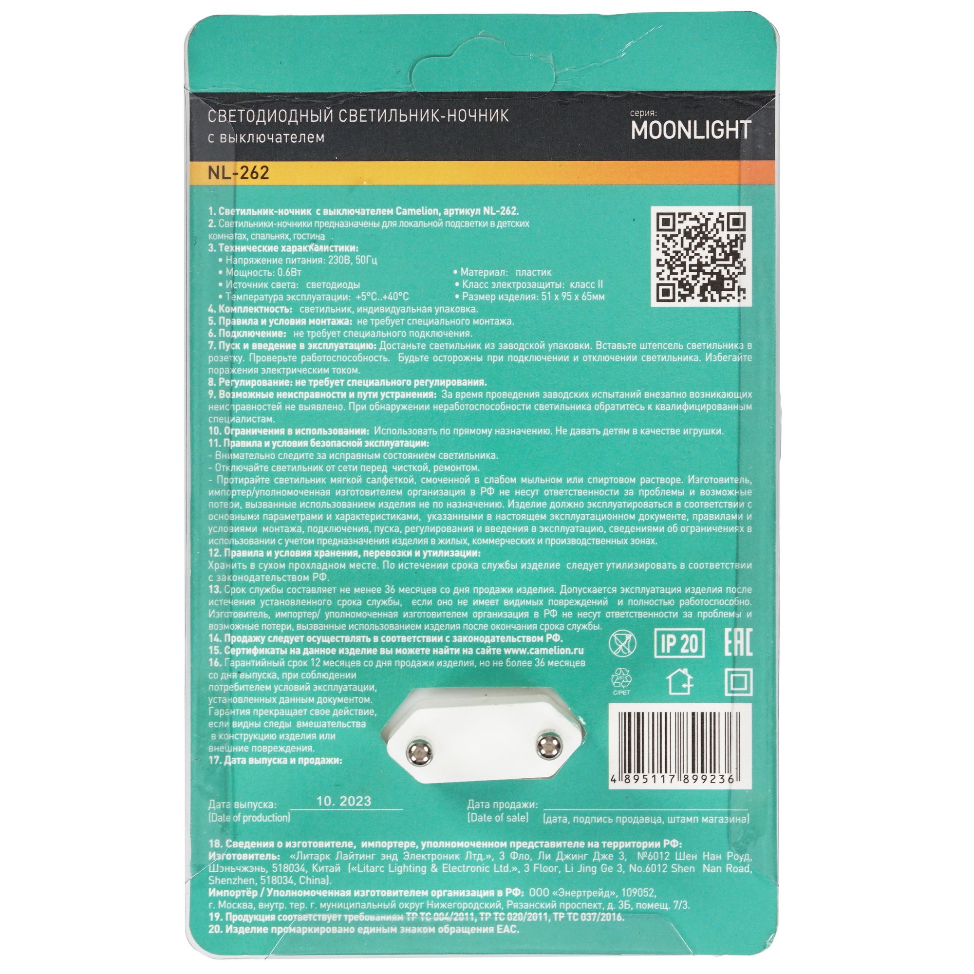 Ночник Camelion NL-262 – настенный светильник в белом округлом корпусе, подключаемый непосредственно в розетку бытовой электросети. Для этого лампа располагает разъемом-вилкой на корпусе. Осветительный прибор используется как средство локальной подсветки для детской или спальной комнаты в ночное время. Мягкий, успокаивающий свет лампы в темное время суток способствует спокойному сну и помогает вставать по ночам. При помощи переключателя на передней панели настенный светильник удобно включать и отключать.