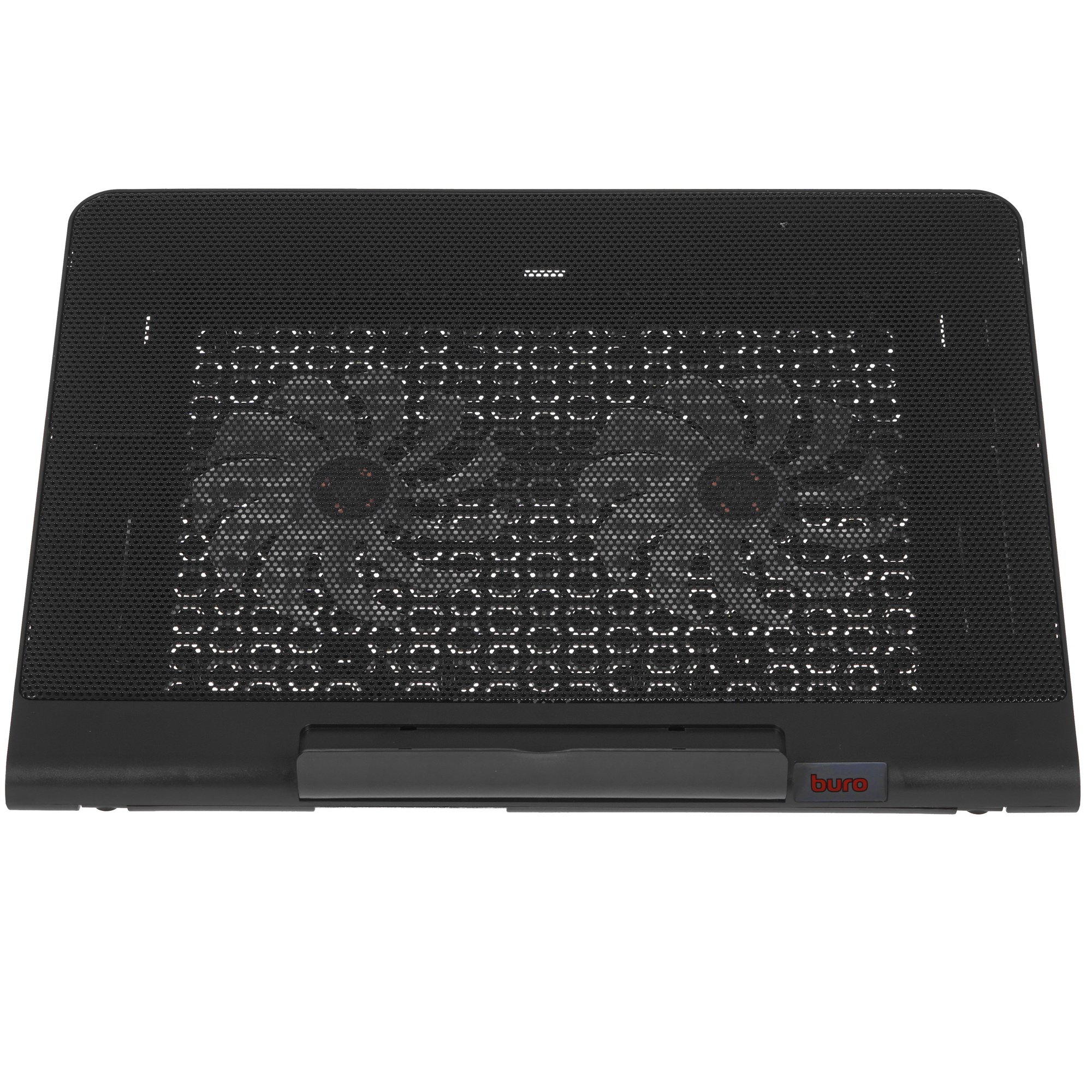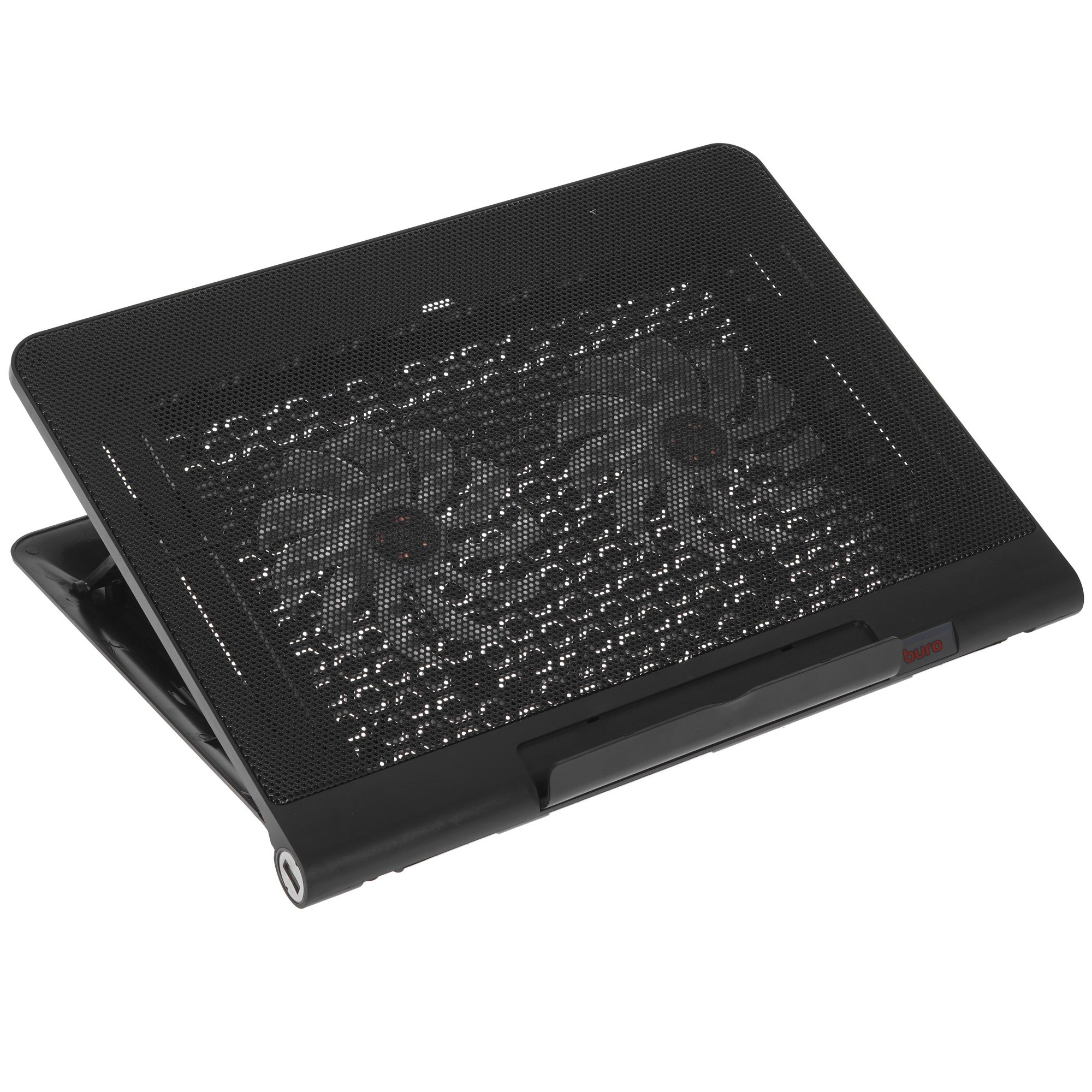 Особенность Buro BU-LCP170-B214 в использовании двух вентиляторов диаметром 140x140 мм. Вращаясь на скорости 1400 об/мин, они эффективно охлаждают комплектующие. Ноутбук устанавливается на металлическую хорошо продуваемую сетку. Подставка дополнена синей подсветкой, поэтому она будет эффектно смотреться в темноте. Для работы вентиляторов и подсветки требуется энергия, для чего подставка подключается к компьютерному порту через USB-кабель.