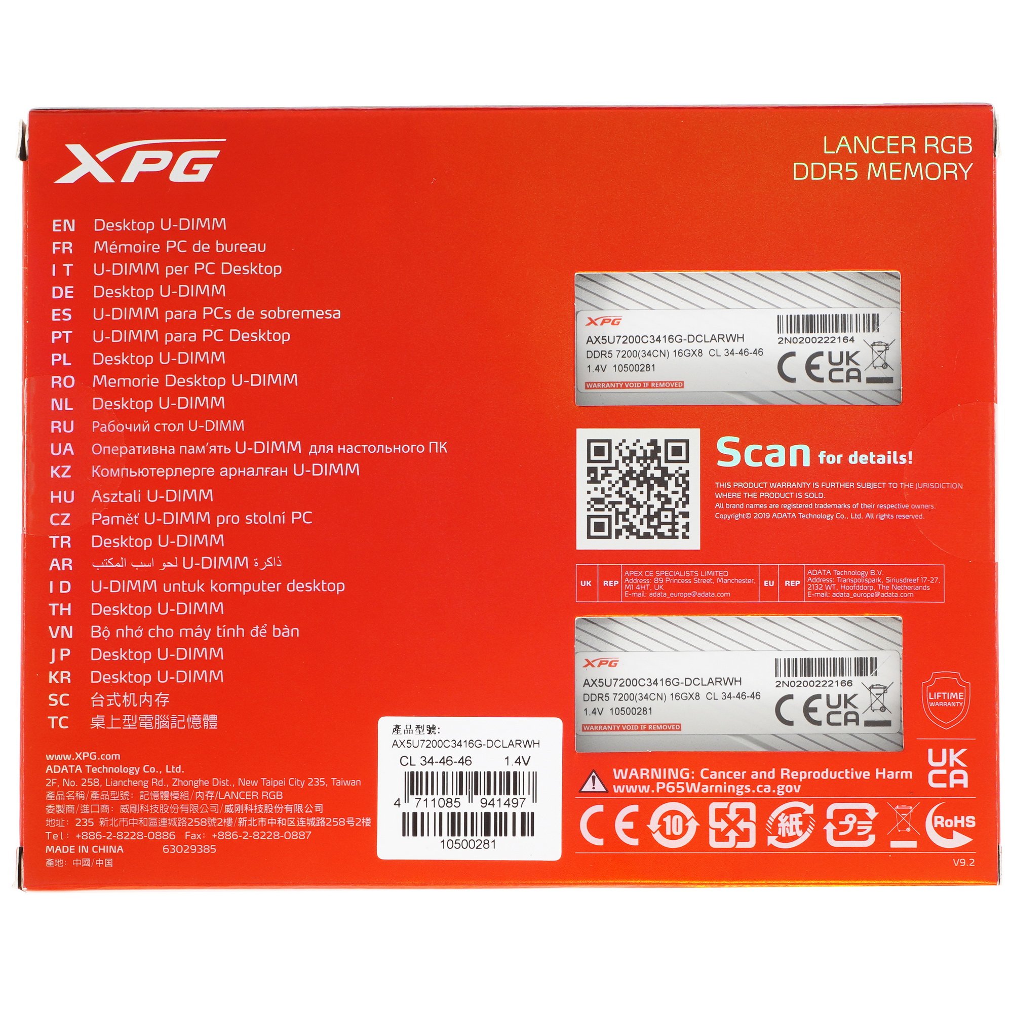 Оперативная память XPG Lancer, DDR5, 32Gb (2x16Gb), 7200MHz, CL34, DIMM, с радиаторами, RGb, белый