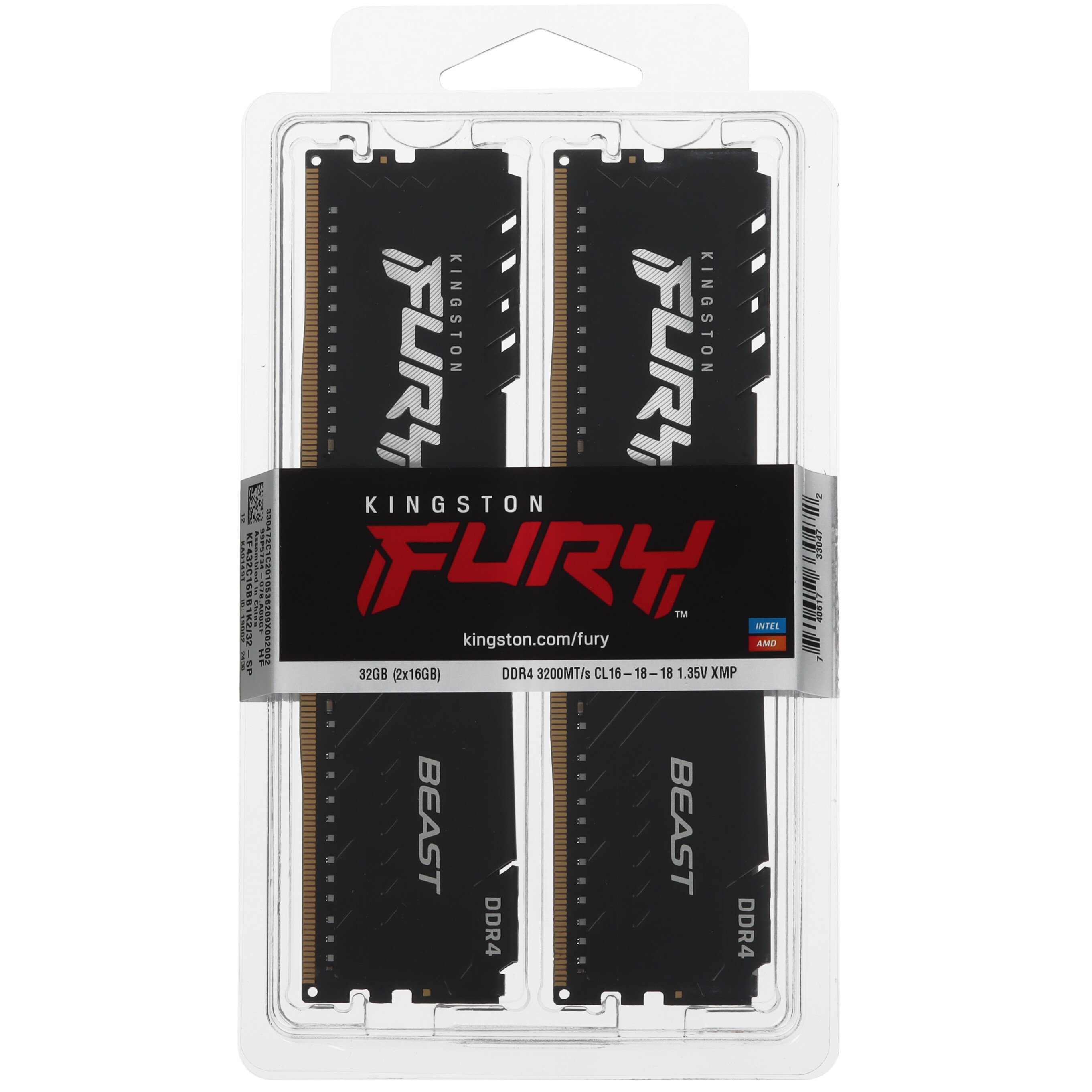Оперативная память Kingston Fury Beast, DDR4, 32Gb (2x16Gb), 3200MHz, CL16, DIMM, с радиатором, черный