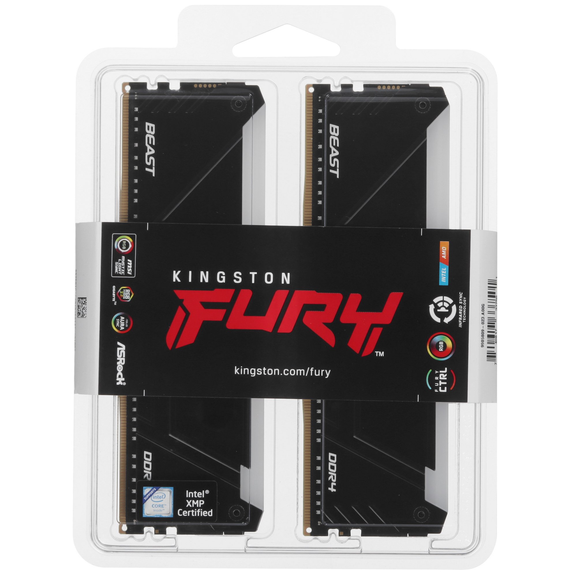 Оперативная память Kingston Fury Beast, DDR4, 16Gb (2x8Gb), 3200MHz, CL16, DIMM, с радиатором, RGb, черный