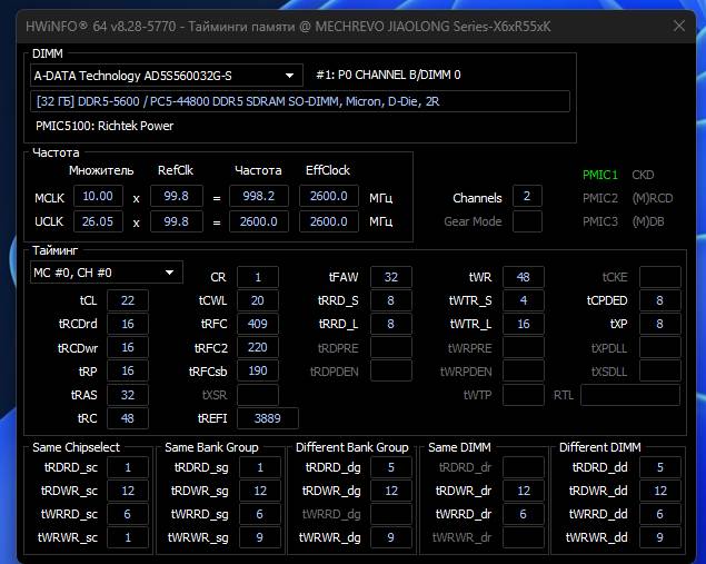 Напряжение питания памяти составляет 1.1 В. Показатель является стандартным для DDR5: он гарантирует модулю минимальное тепловыделение. Память не имеет радиатора, но не перегревается при любых нагрузках. Энергопотребление устройства оптимизирует технология Power Management IC.