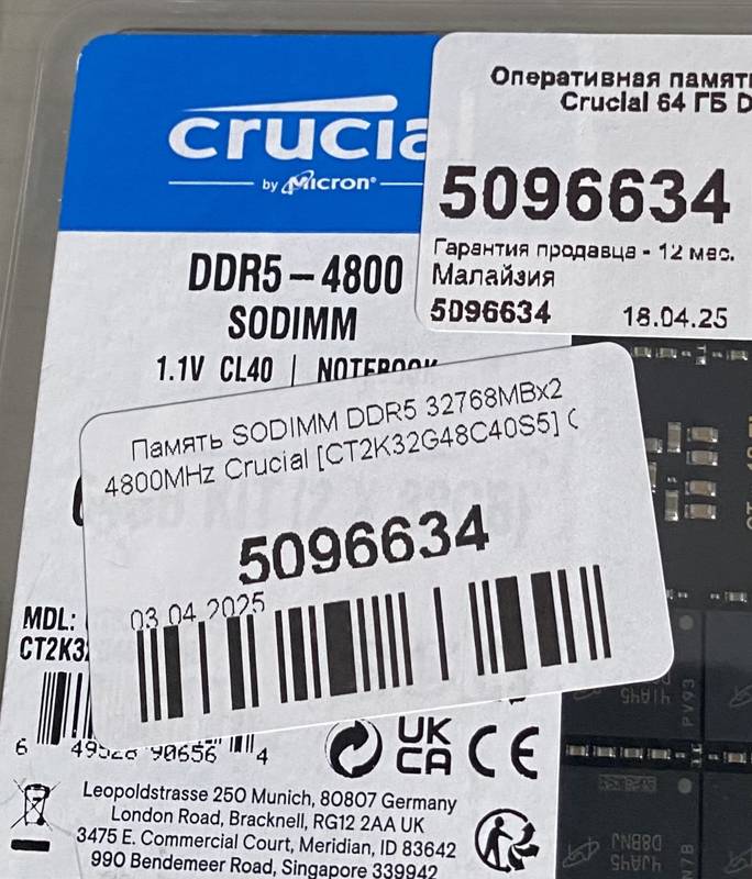 Оперативная память SODIMM Crucial [CT2K32G48C40S5] использует напряжение питания 1.1 В. Это стандартный показатель для DDR5: он гарантирует низкое энергопотребление и минимальное тепловыделение модулей. Несмотря на отсутствие радиаторов, память не подвержена избыточному нагреву при любых нагрузках.