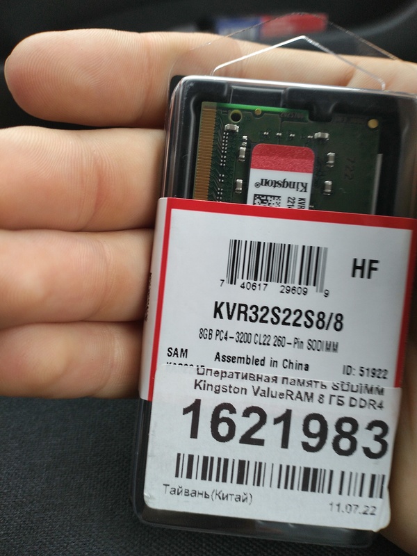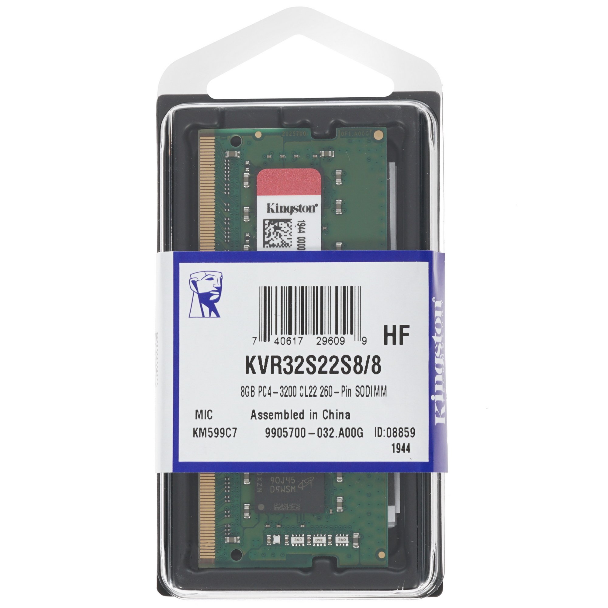 Оперативная память Kingston ValueRAM, DDR4, 8Gb (1x8Gb), 3200MHz, CL22, SO-DIMM