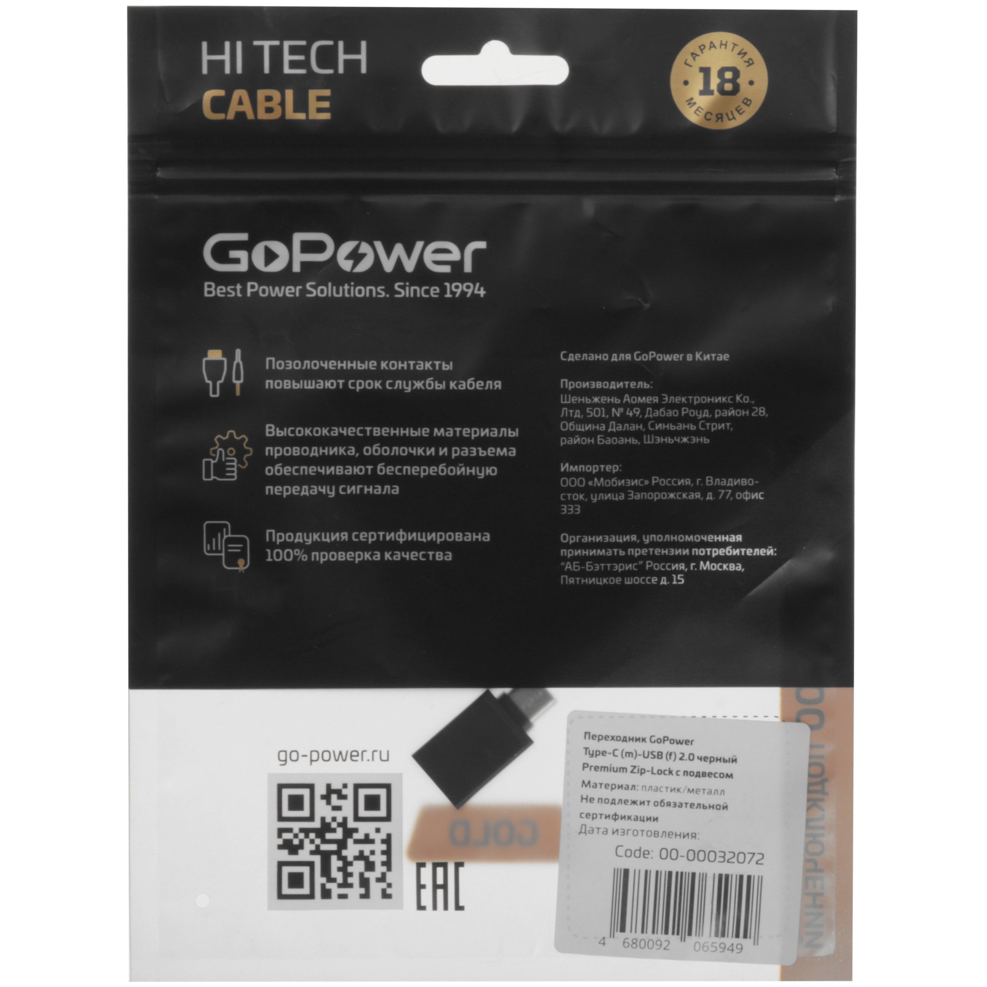 Переходник GoPower Type-C (m)-USB (f) 2.0 черный Premium Zip-Lock c подвесом (1/500)