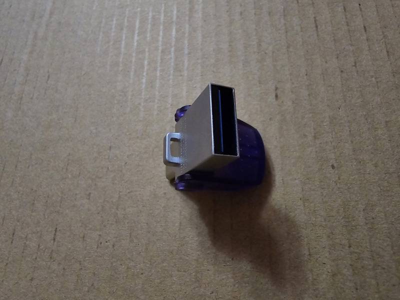 Накопитель миниатюрен. Длина устройства составляет лишь 29.9 мм. Особенность модели – эффектный дизайн, оформленный с помощью фиолетового цвета.