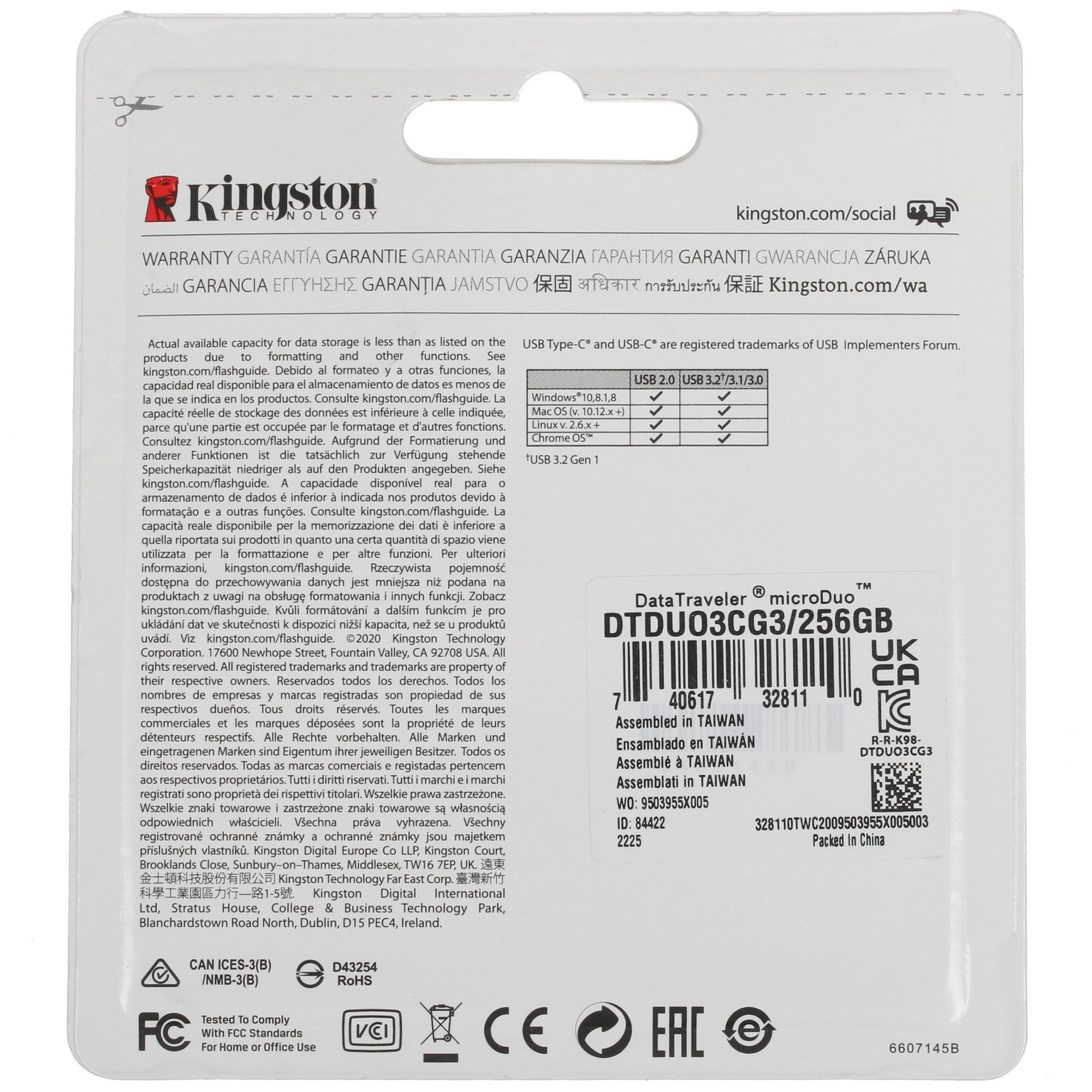 Память OTG USB Flash 256 ГБ Kingston DataTraveler MicroDuo 3C [DTDUO3CG3/256GB] отличается чрезвычайно высокой (до 200 МБ/с) скоростью чтения. Максимальная скорость записи – 15 МБ/с. Накопитель поддерживает стандарт USB 3.2 Gen1. Пропускная способность такого USB-подключения (5 Гбит/с) более чем втрое выше пиковой скорости чтения, обеспечиваемой устройством. Обратная совместимость позволяет накопителю взаимодействовать с USB-портами предыдущих версий.