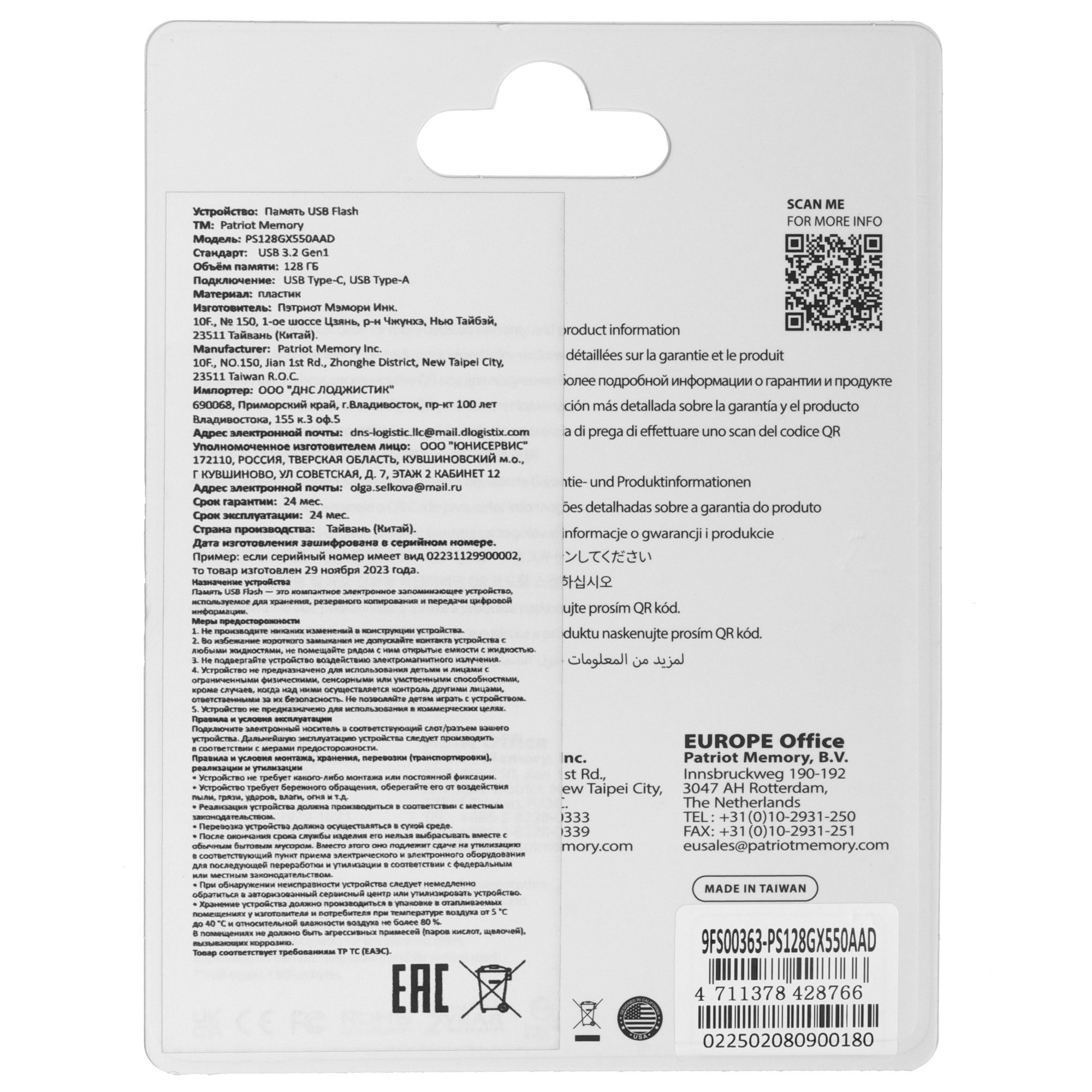Память USB Flash 128 ГБ Patriot Xropter X550 [PS128GX550AAD] оснащена разъемами USB Type-A и USB Type-C. Максимальная скорость чтения модели – 80 МБ/с.