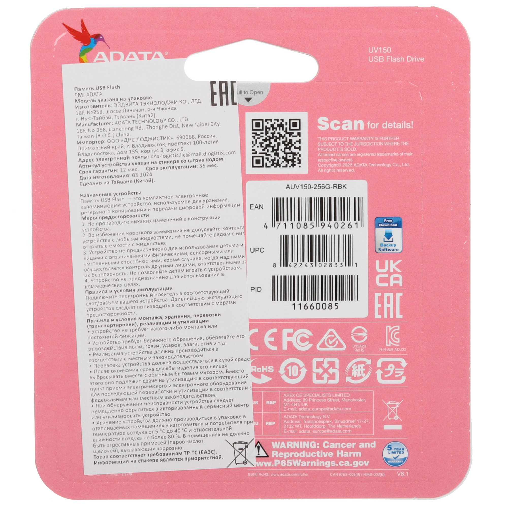 Флешка USB ADATA UV150 (AUV150-256G-RBK), 256Gb, USB 3.0, R/W 100/30, черный
